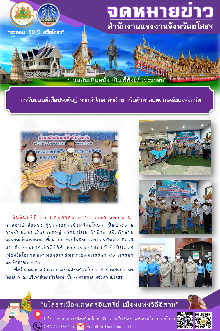 สรจ.ยโสธร ร่วมรับมอบผีเสื้อประดิษฐ์ จากผ้าไหม ผ้าฝ้าย หรือผ้าตามอัตลักษณ์ของจังหวัด