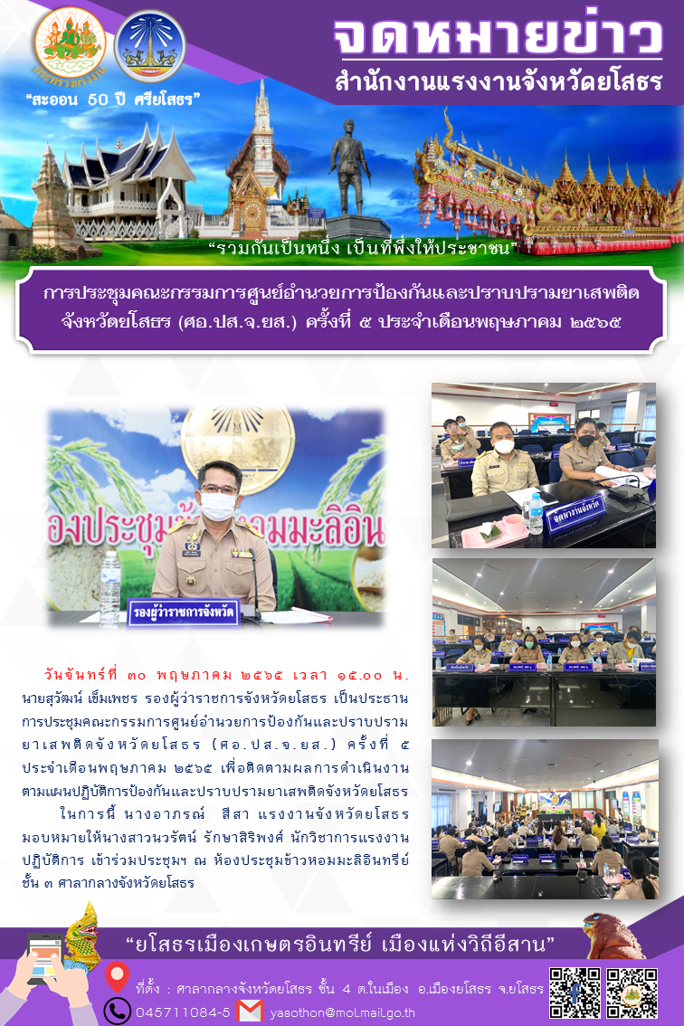 การประชุมคณะกรรมการศูนย์อำนวยการป้องกันและปราบปรามยาเสพติดจังหวัดยโสธร (ศอ.ปส.จ.ยส.) ครั้งที่ 5 ประจำเดือนพฤษภาคม 2565