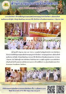แรงงานจังหวัดตาก เข้าร่วมพิธีทำบุญตักบาตรถวายพระราชกุศล กิจกรรมเฉลิมพระเกียรติสมเด็จพระนางเจ้าสุทิดา พัชรสุธาพิมลลักษณ พระบรมราชินี เนื่องในโอกาสวันเฉลิมพระชนมพรรษา 3 มิถุนายน 2565