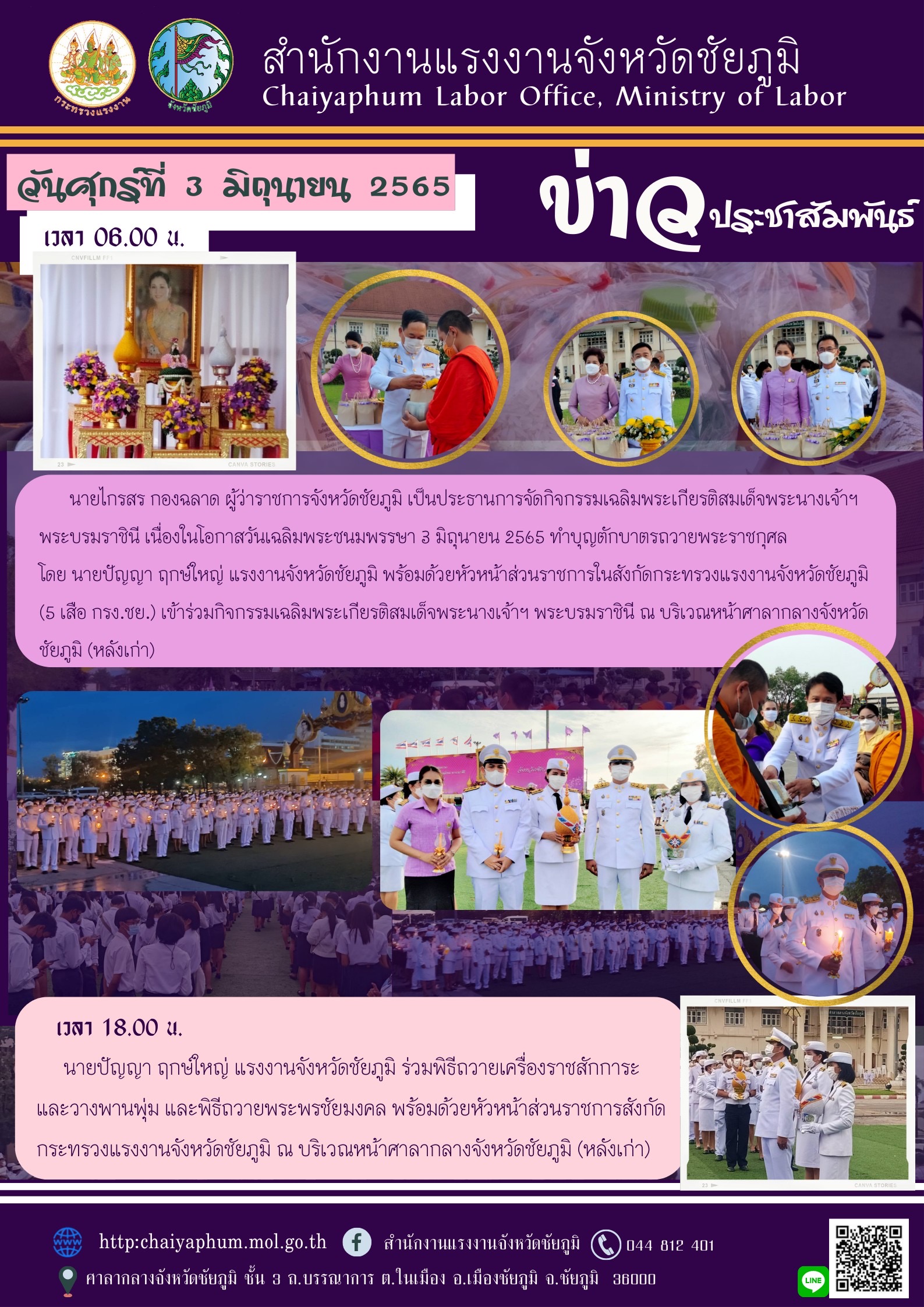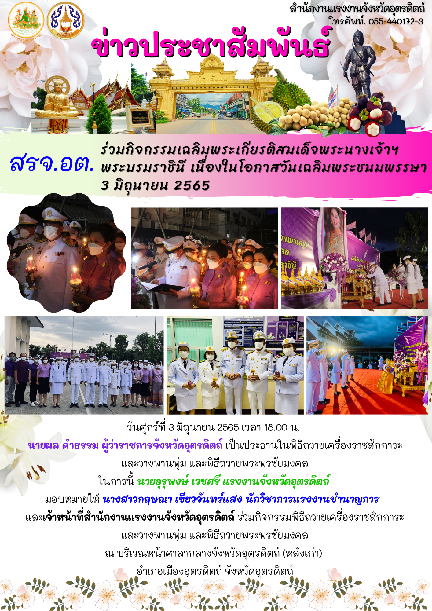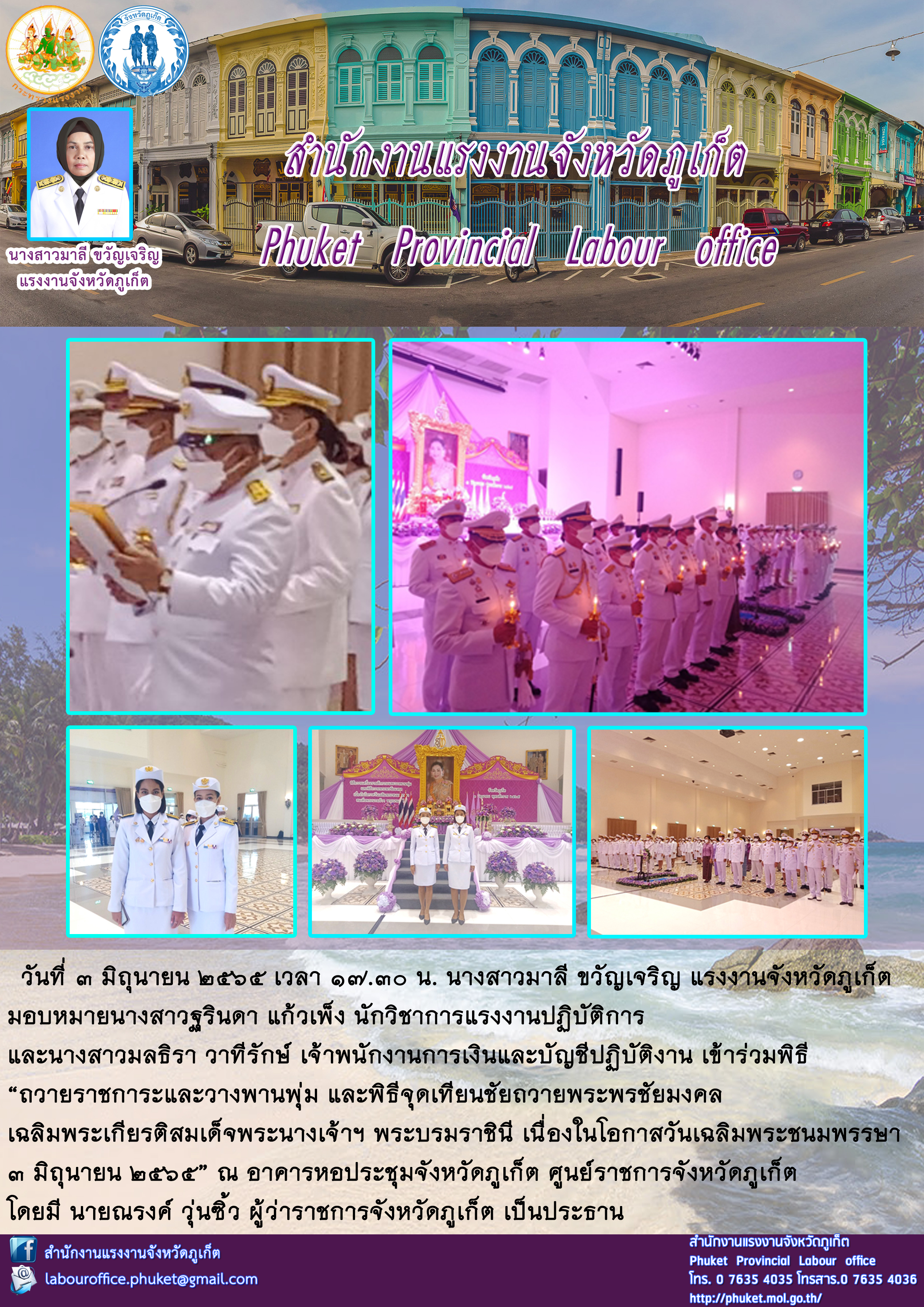 แรงงานจังหวัดภูเก็ต ร่วมพิธี “ถวายราชการะและวางพานพุ่ม และพิธีจุดเทียนชัยถวายพระพรชัยมงคล เฉลิมพระเกียรติสมเด็จพระนางเจ้าฯ พระบรมราชินี เนื่องในโอกาสวันเฉลิมพระชนมพรรษา 3 มิถุนายน 2565”