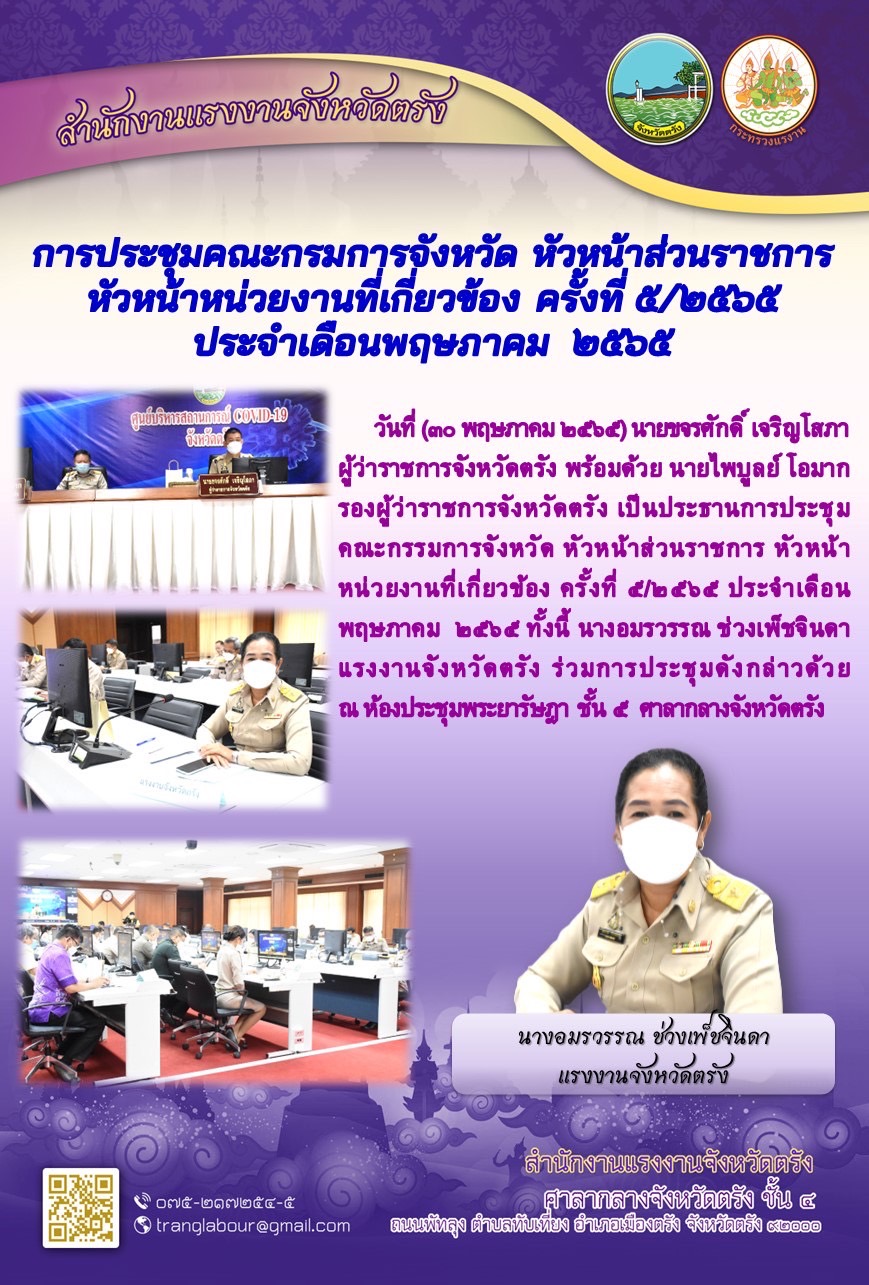 แรงงานจังหวัดตรัง ร่วมประชุมคณะกรมการจังหวัด หัวหน้าส่วนราชการจังหวัดตรังและหน่วยงานที่เกี่ยวข้อง ประจำเดือนพฤษภาคม 2565