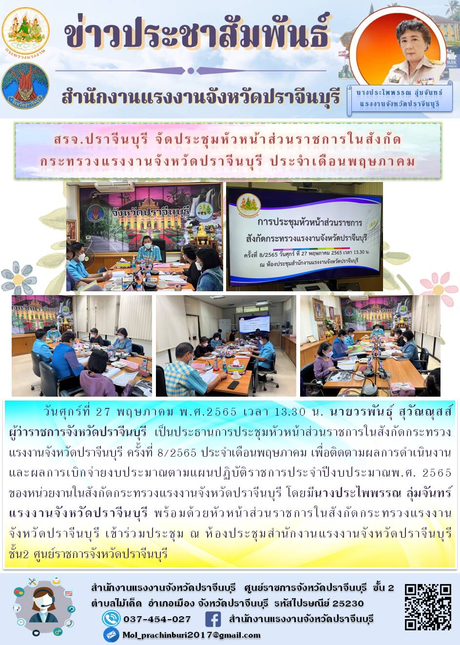 สรจ.ปราจีนบุรี จัดประชุมหัวหน้าส่วนราชการในสังกัด กระทรวงแรงงานจังหวัดปราจีนบุรี ประจำเดือนพฤษภาคม