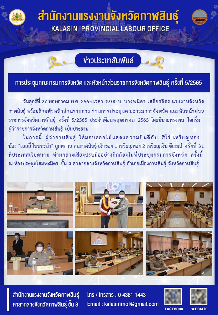 แรงงานจังหวัดกาฬสินธุ์ ร่วมการประชุมคณะกรมการจังหวัด และหัวหน้าส่วนราชการจังหวัดกาฬสินธุ์ ครั้งที่ 5/2565