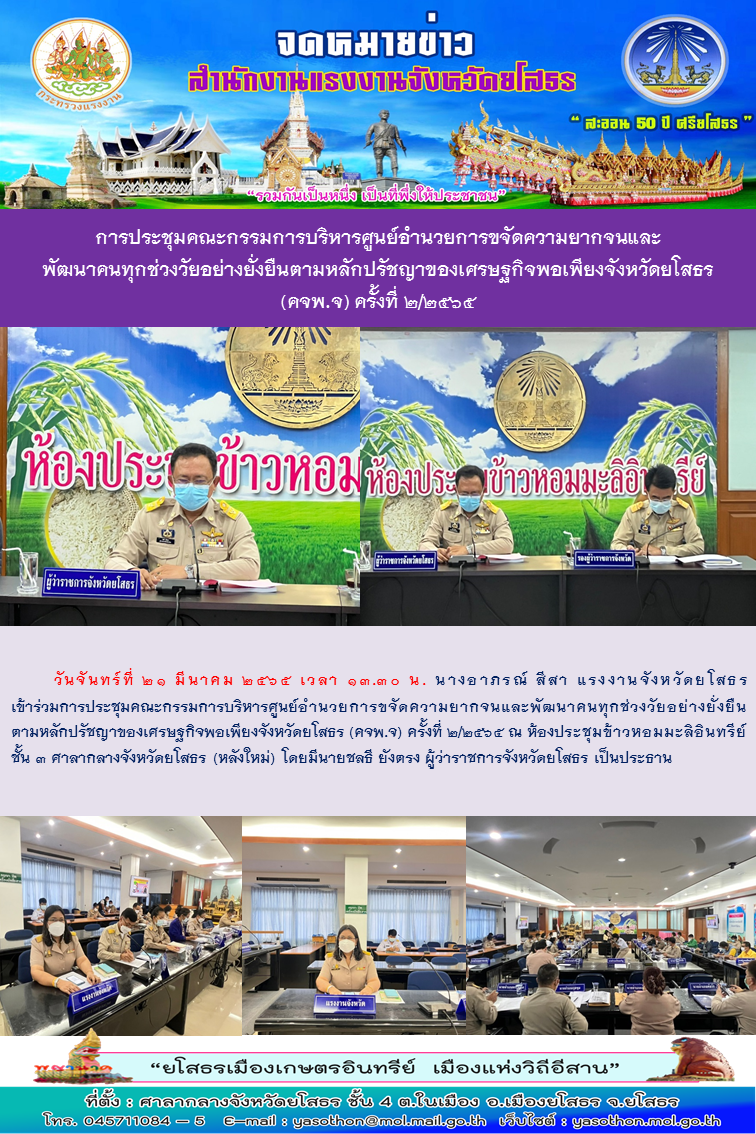 การประชุมคณะกรรมการบริหารศูนย์อำนวยการขจัดความยากจนและพัฒนาคนทุกช่วงวัยอย่างยั่งยืนตามหลักปรัชญาของเศรษฐกิจพอเพียงจังหวัดยโสธร (คจพ.จ) ครั้งที่ 2/2565