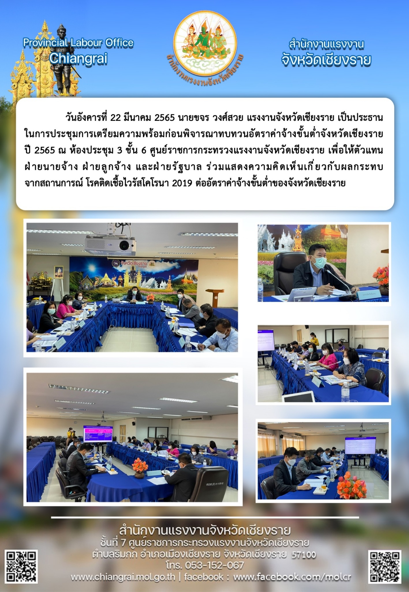 แรงงานจังหวัดเชียงราย เป็นประธานในการประชุมการเตรียมความพร้อมก่อนพิจารณาทบทวนอัตราค่าจ้างขั้นต่ำจังหวัดเชียงราย ปี 2565