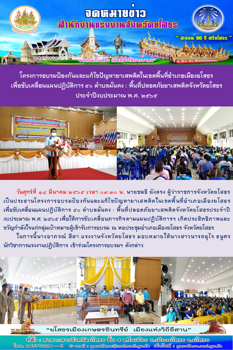 โครงการอบรมป้องกันและแก้ไขปัญหายาเสพติดในเขตพื้นที่อำเภอเมืองยโสธร เพื่อขับเคลื่อนแผนปฏิบัติการ ๕๐ ตำบลมั่นคง : พื้นที่ปลอดภัยยาเสพติดจังหวัดยโสธรประจำปีงบประมาณ พ.ศ. ๒๕๖๕