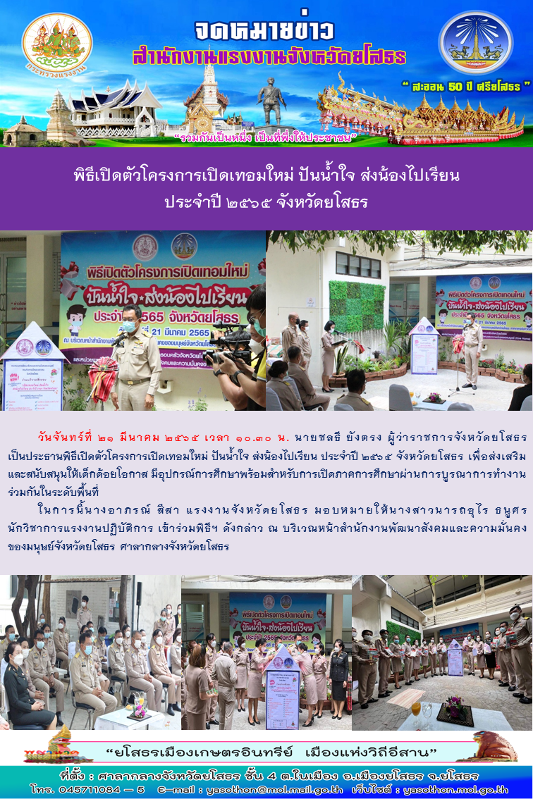 พิธีเปิดตัวโครงการเปิดเทอมใหม่ ปันน้ำใจ ส่งน้องไปเรียน ประจำปี ๒๕๖๕ จังหวัดยโสธร