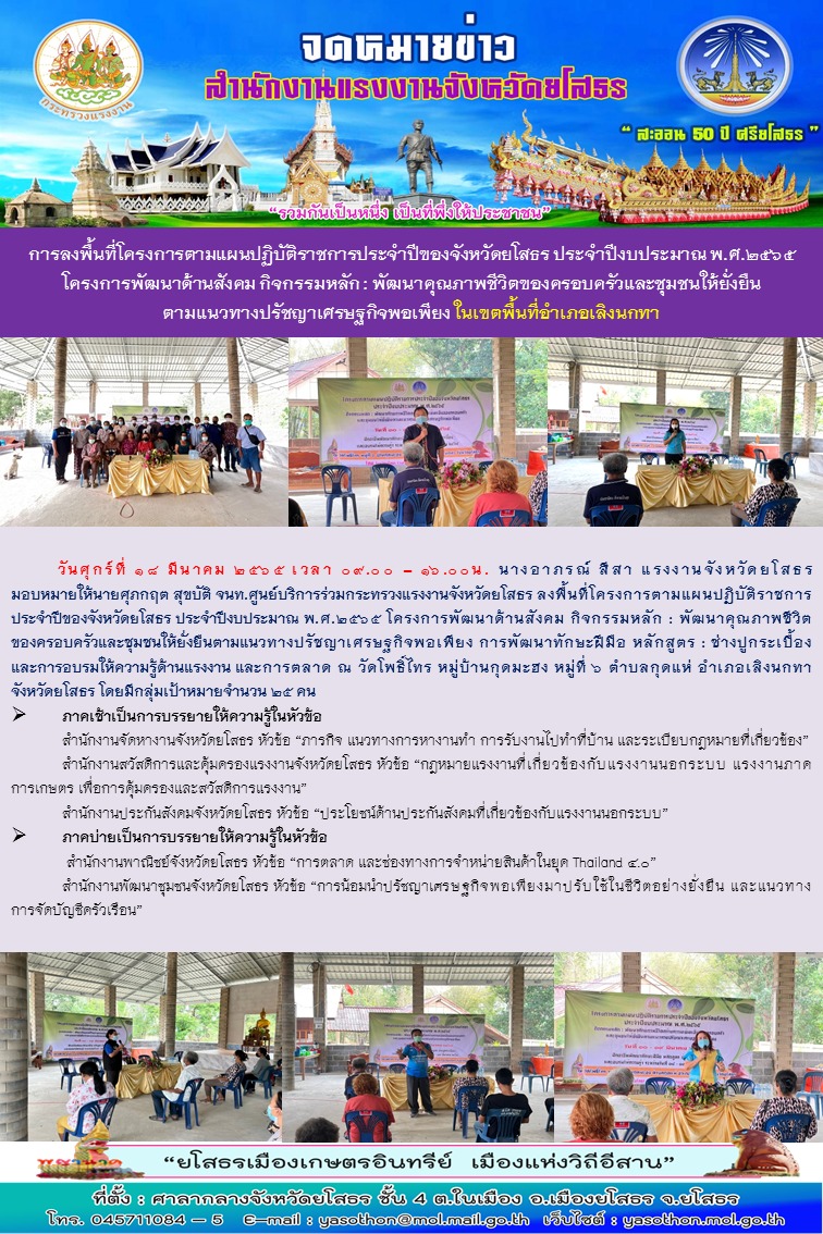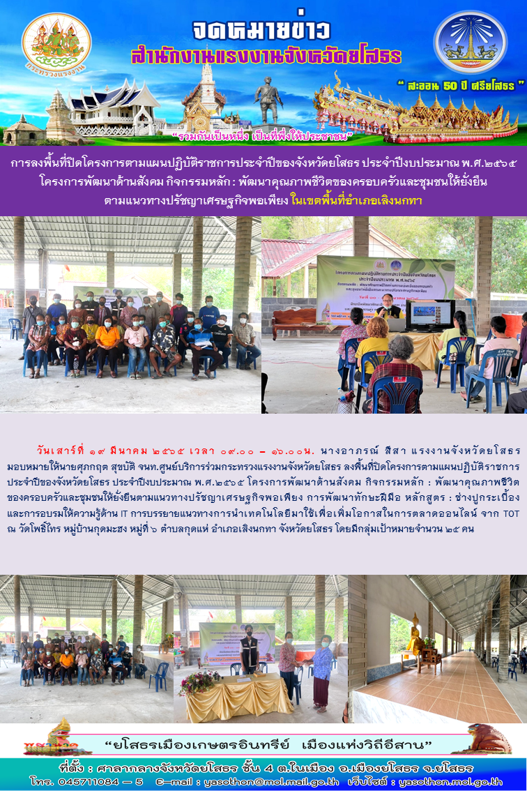 การลงพื้นที่โครงการตามแผนปฏิบัติราชการประจำปีของจังหวัดยโสธร ประจำปีงบประมาณ พ.ศ.2565 โครงการพัฒนาด้านสังคม กิจกรรมหลัก : พัฒนาคุณภาพชีวิตของครอบครัวและชุมชนให้ยั่งยืนตามแนวทางปรัชญาเศรษฐกิจพอเพียง ในเขตพื้นที่อำเภอเลิงนกทา