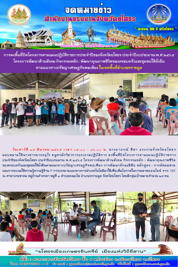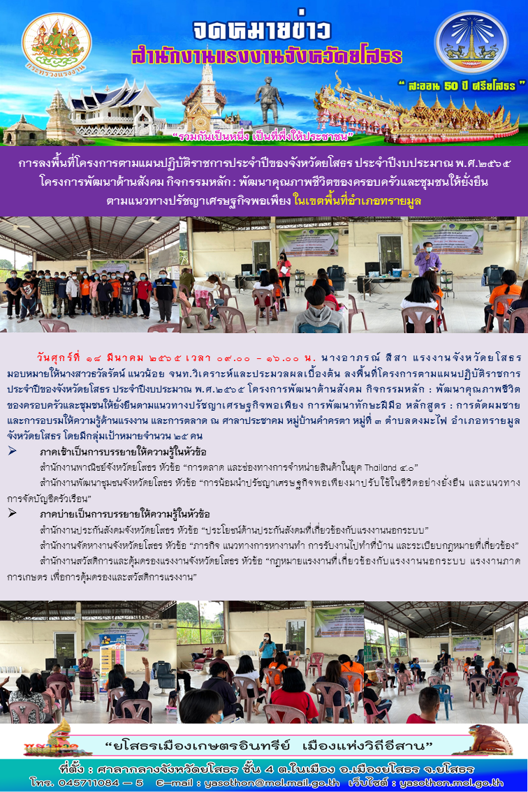 การลงพื้นที่โครงการตามแผนปฏิบัติราชการประจำปีของจังหวัดยโสธร ประจำปีงบประมาณ พ.ศ.2565 โครงการพัฒนาด้านสังคม กิจกรรมหลัก : พัฒนาคุณภาพชีวิตของครอบครัวและชุมชนให้ยั่งยืนตามแนวทางปรัชญาเศรษฐกิจพอเพียง ในเขตพื้นที่อำเภอทรายมูล