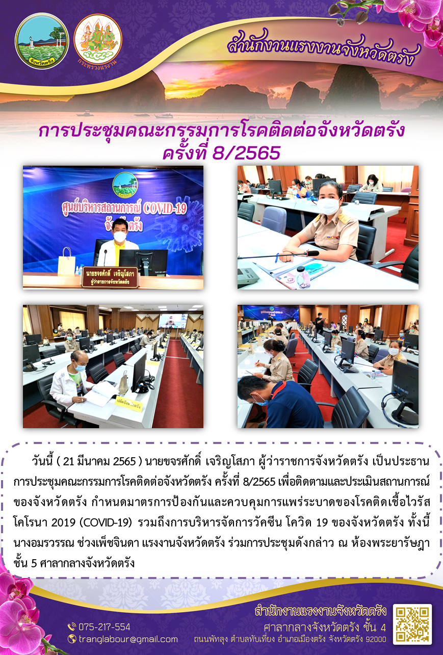 แรงงานจังหวัดตรัง ร่วมการประชุมคณะกรรมการโรคติดต่อจังหวัดตรัง ครั้งที่ 8/2565