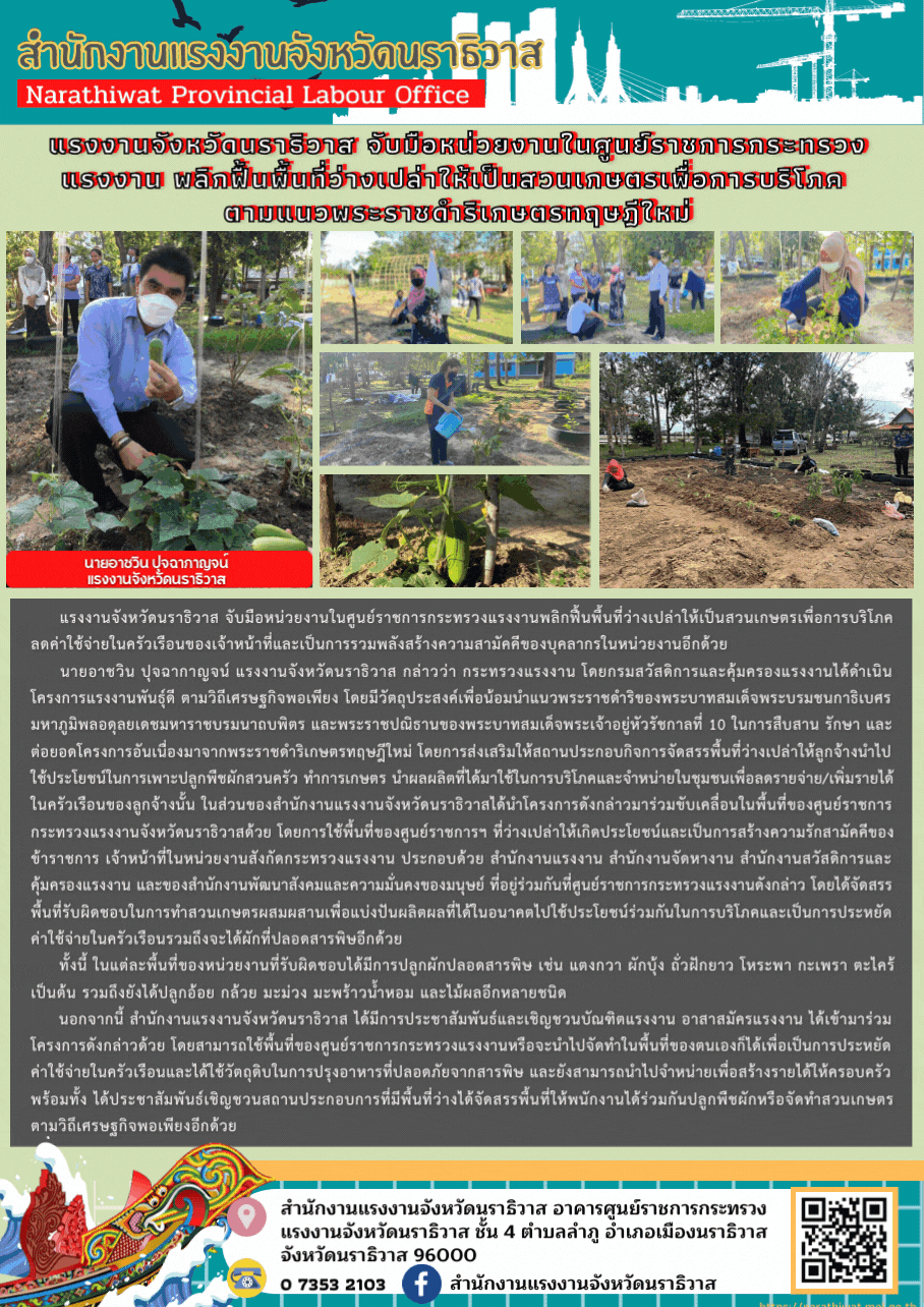 แรงงานจังหวัดนราธิวาส จับมือหน่วยงานในศูนย์ราชการกระทรวงแรงงาน พลิกฟื้นพื้นที่ว่างเปล่าให้เป็นสวนเกษตรเพื่อการบริโภคตามแนวพระราชดำริเกษตรทฤษฎีใหม่