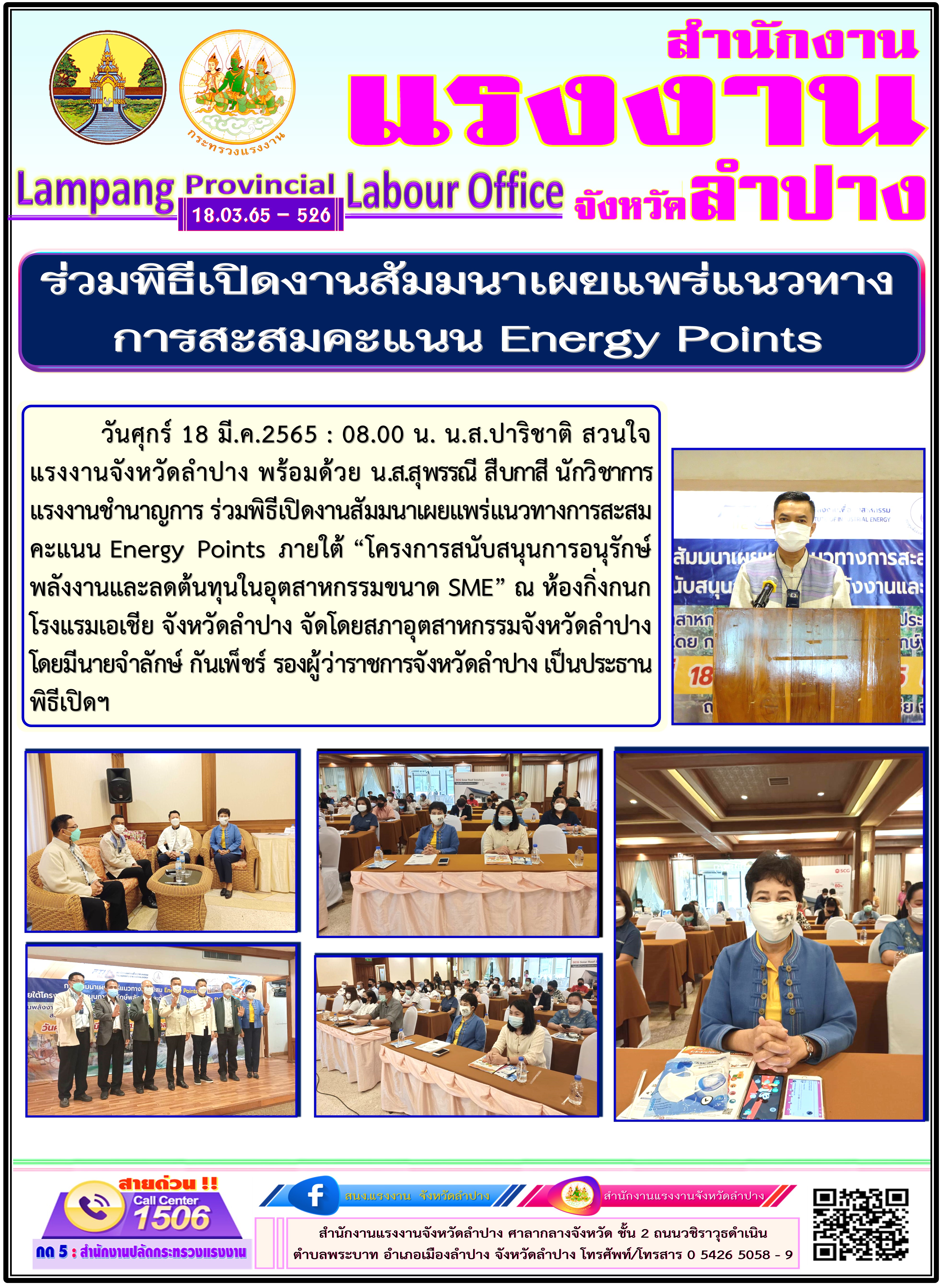สรจ.ลำปาง ร่วมพิธีเปิดงานสัมมนาเผยแพร่แนวทางการสะสมคะแนน Energy Points ภายใต้ “โครงการสนับสนุนการอนุรักษ์ พลังงานและลดต้นทุนในอุตสาหกรรมขนาด SME”