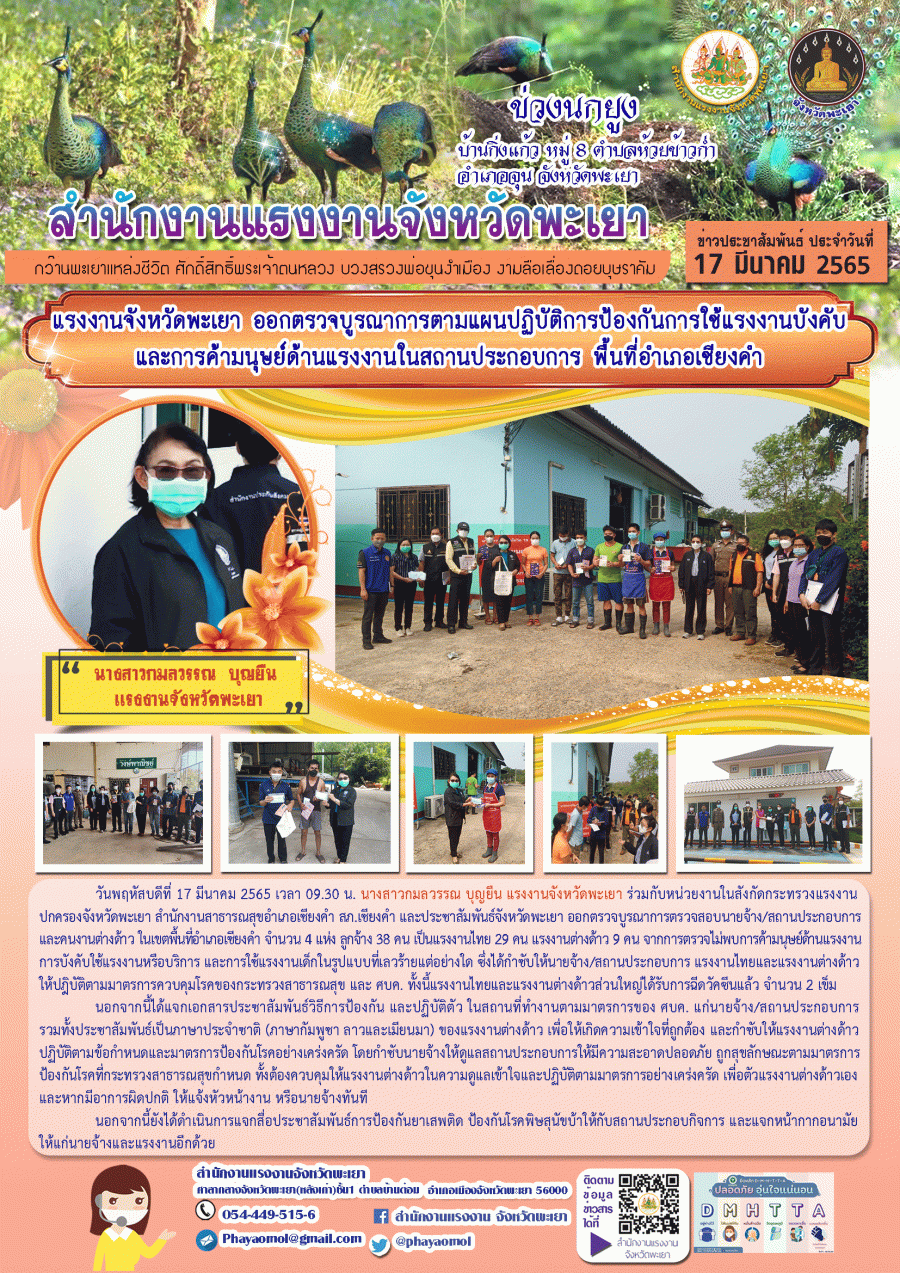 แรงงานจังหวัดพะเยา ออกตรวจบูรณาการตามแผนปฏิบัติการป้องกันการใช้แรงงานบังคับและการค้ามนุษย์ด้านแรงงานในสถานประกอบการ พื้นที่อำเภอเชียงคำ