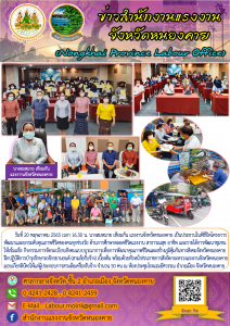 แรงงานจังหวัดหนองคาย เป็นประธานในพิธีปิดโครงการพัฒนาและยกระดับคุณภาพชีวิตของคนทุกช่วงวัย ด้านการศึกษาตลอดชีวิตแรงงาน สาธารณสุข อาชีพ และรายได้การพัฒนาชุมชน ให้เข้มแข็ง กิจกรรมการจัดระเบียบสังคมแบบบูรณาการเพื่อการพัฒนาคุณภาพชีวิตและสร้างภูมิคุ้มกันทางสังคมจังหวัดหนองคาย