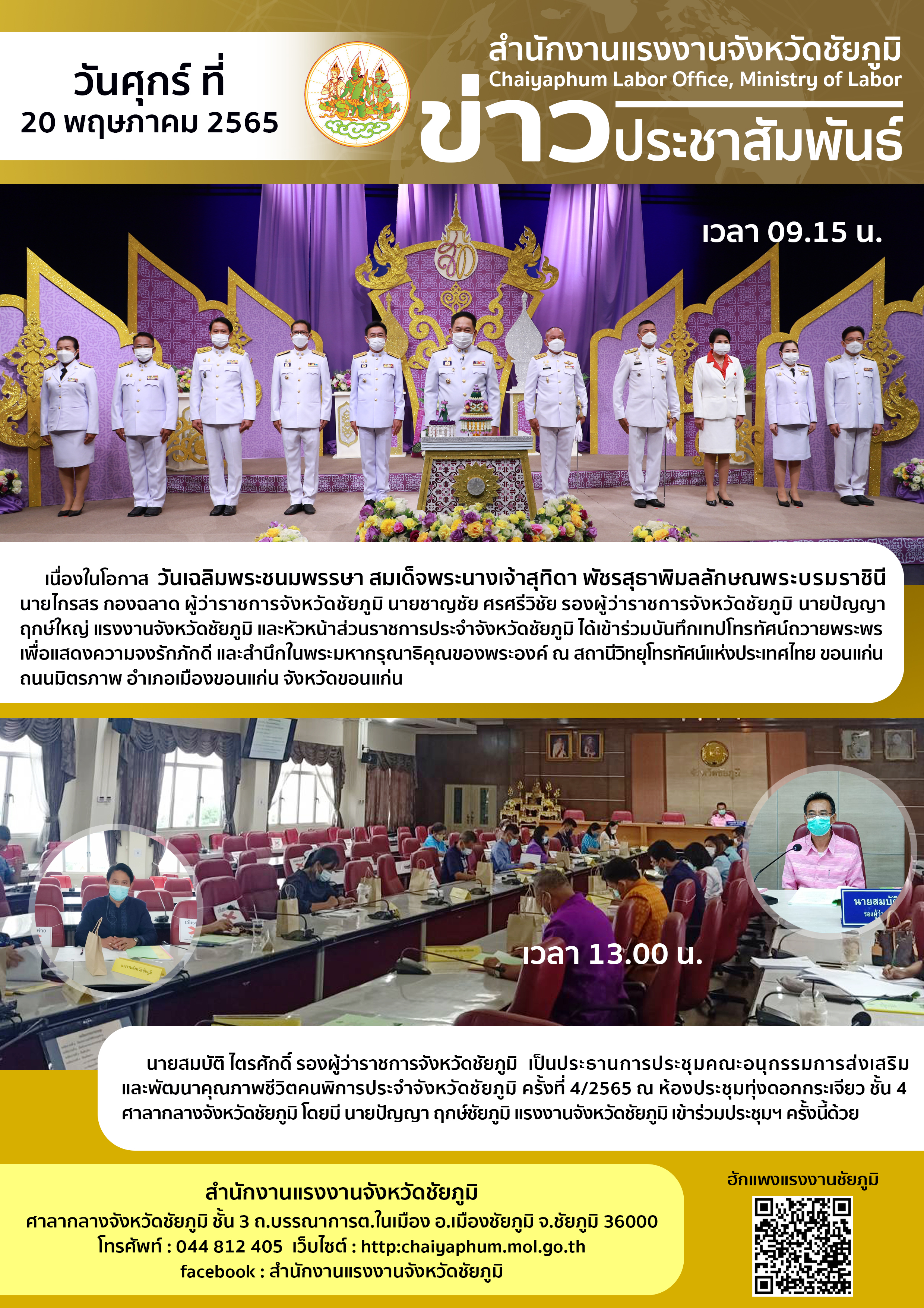 ภารกิจสำนักงานแรงงานจังหวัดชัยภูมิ ประจำวันที่ 20 พฤษภาคม 2565