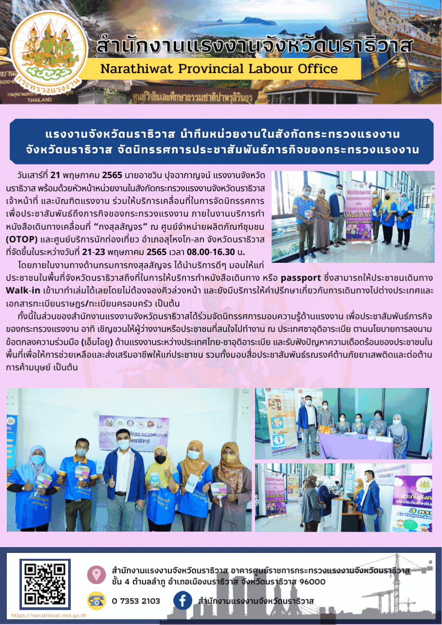 แรงงานจังหวัดนราธิวาส นำทีมหน่วยงานในสังกัดกระทรวงแรงงานจังหวัดนราธิวาสจัดนิทรรศการประชาสัมพันธ์ภารกิจของกระทรวงแรงงาน