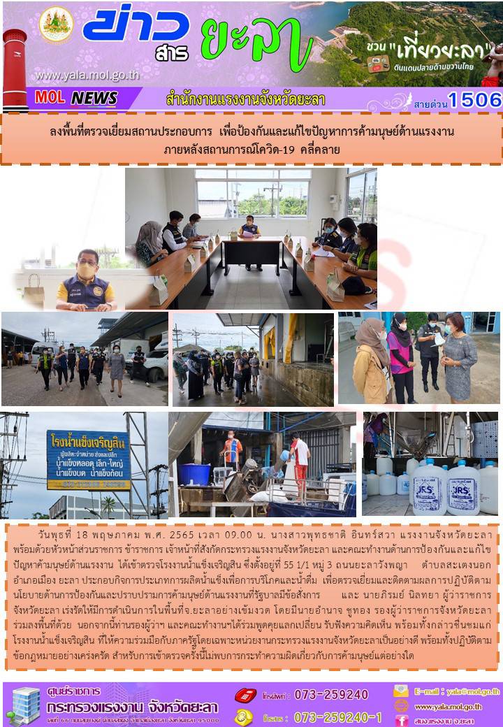 สรจ.ยะลา ลงพื้นที่ตรวจเยี่ยมสถานประกอบการ เพื่อป้องกันเเละแก้ไขปัญหาการค้ามนุษย์ด้านแรงงาน ภายหลังสถานการณ์โควิด – 19 คลี่คลาย