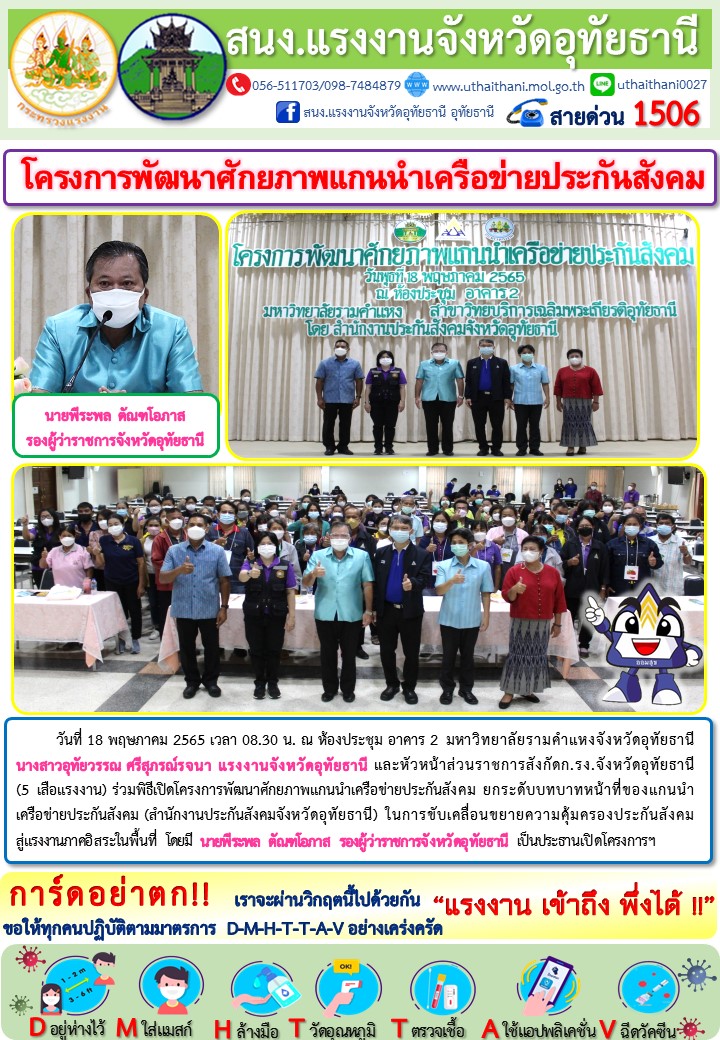 แรงงานจังหวัดอุทัยธานี ร่วมพิธีเปิดโครงการพัฒนาศักยภาพแกนนำเครือข่ายประกันสังคม
