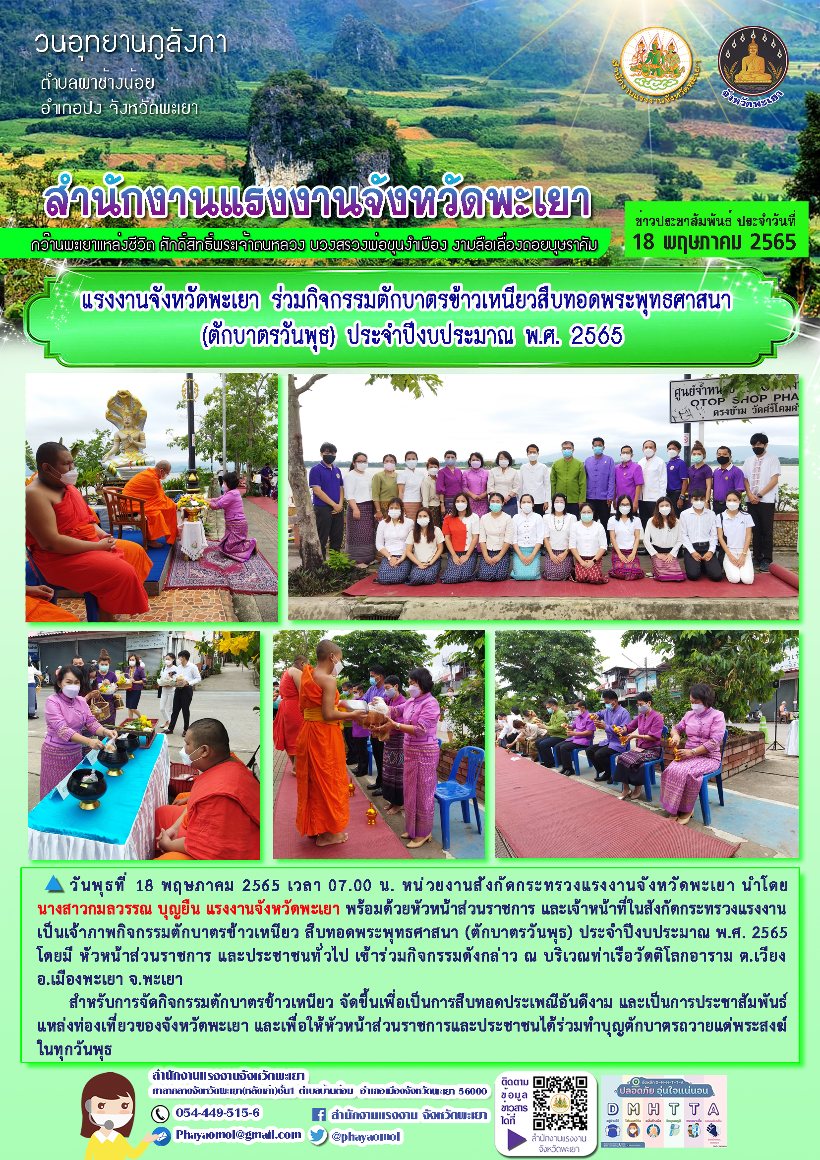 แรงงานจังหวัดพะเยา ร่วมกิจกรรมตักบาตรข้าวเหนียวสืบทอดพระพุทธศาสนา (ตักบาตรวันพุธ) ประจำปีงบประมาณ พ.ศ. 2565