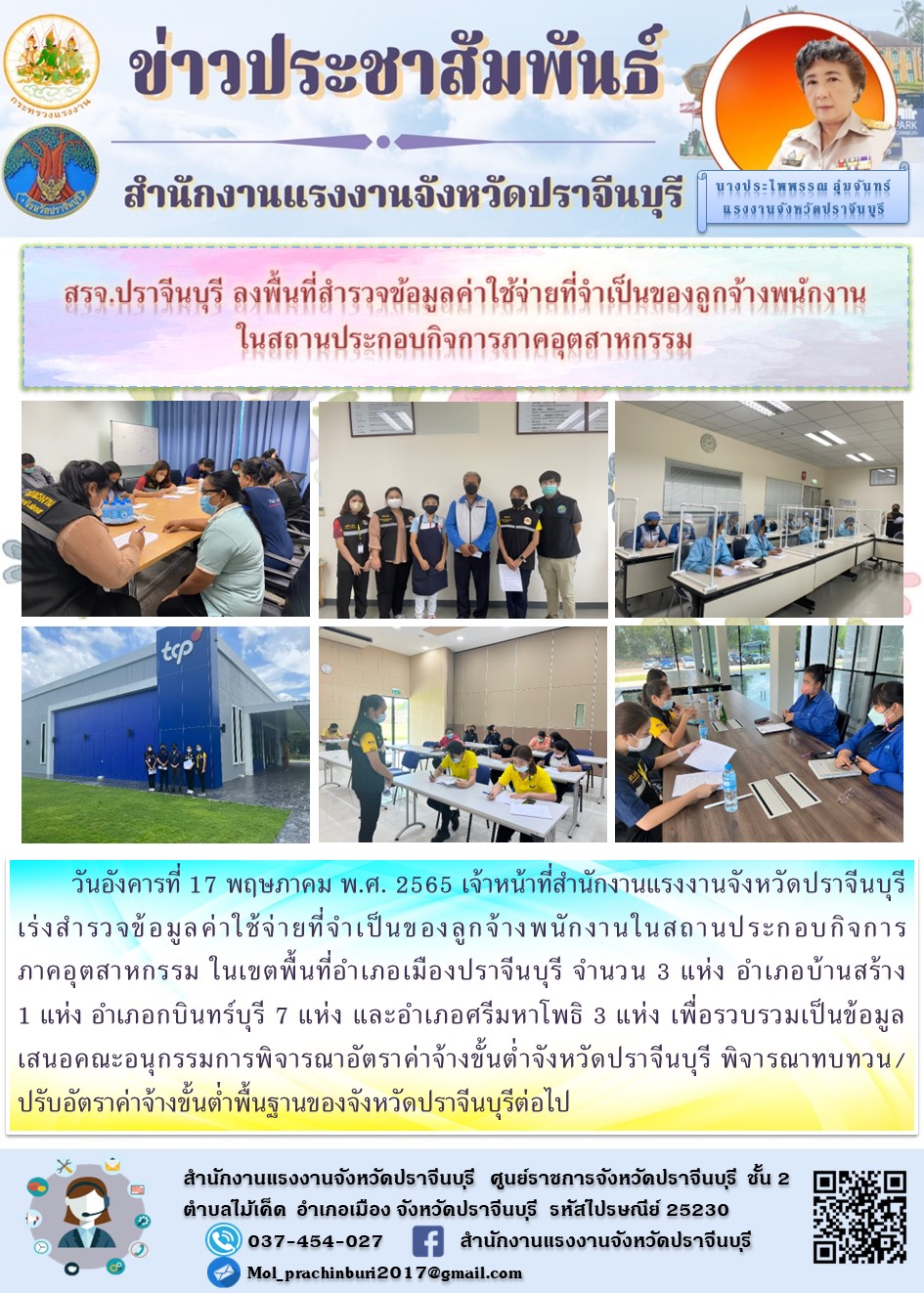 เจ้าหน้าที่สำนักงานแรงงานจังหวัดปราจีนบุรี เร่งสำรวจข้อมูลค่าใช้จ่ายที่จำเป็นของลูกจ้างพนักงานในสถานประกอบกิจการภาคอุตสาหกรรม