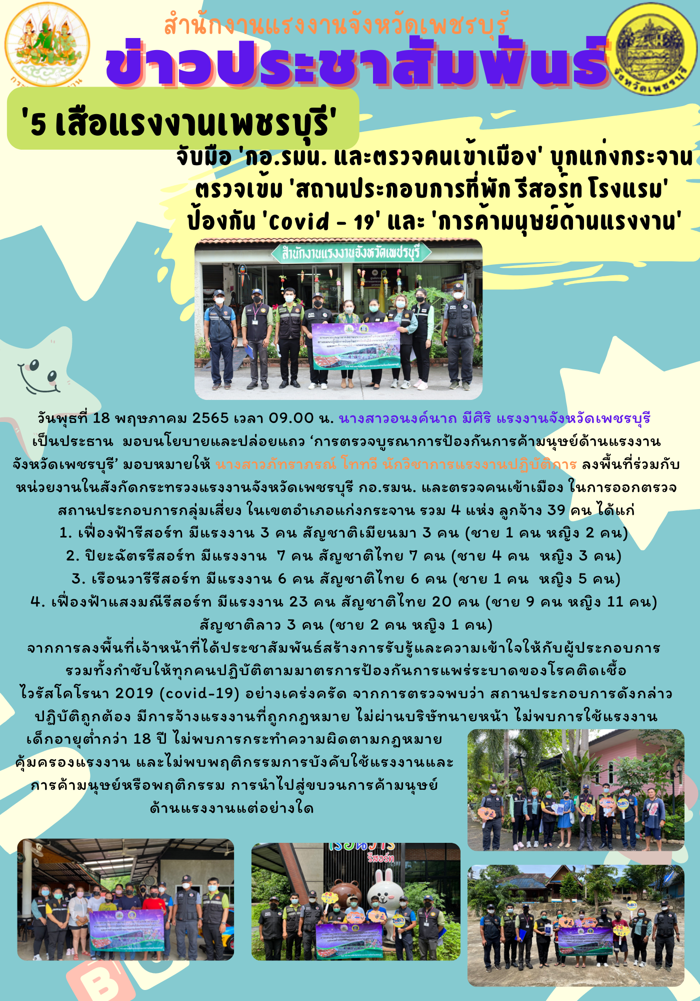 ‘5 เสือแรงงานเพชรบุรี’ จับมือ ‘กอ.รมน. และตรวจคนเข้าเมือง’ บุกแก่งกระจาน ตรวจเข้ม ‘สถานประกอบการที่พัก รีสอร์ท โรงแรม’ ป้องกัน ‘Covid – 19’ และ ‘การค้ามนุษย์ด้านแรงงาน’