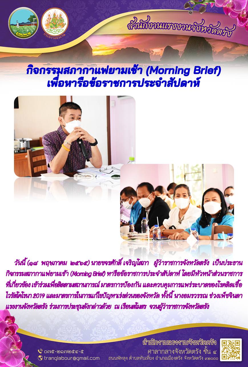 แรงงานจังหวัดตรัง ร่วมกิจกรรมสภากาแฟยามเช้า (Morning Brief) หารือข้อราชการประจำสัปดาห์