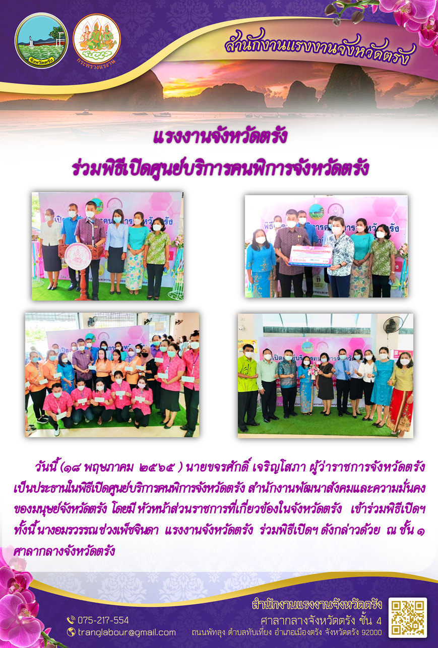 แรงงานจังหวัดตรัง ร่วมพิธีเปิดศูนย์บริการคนพิการจังหวัดตรัง สำนักงานพัฒนาสังคมและความมั่นคงของมนุษย์จังหวัดตรัง