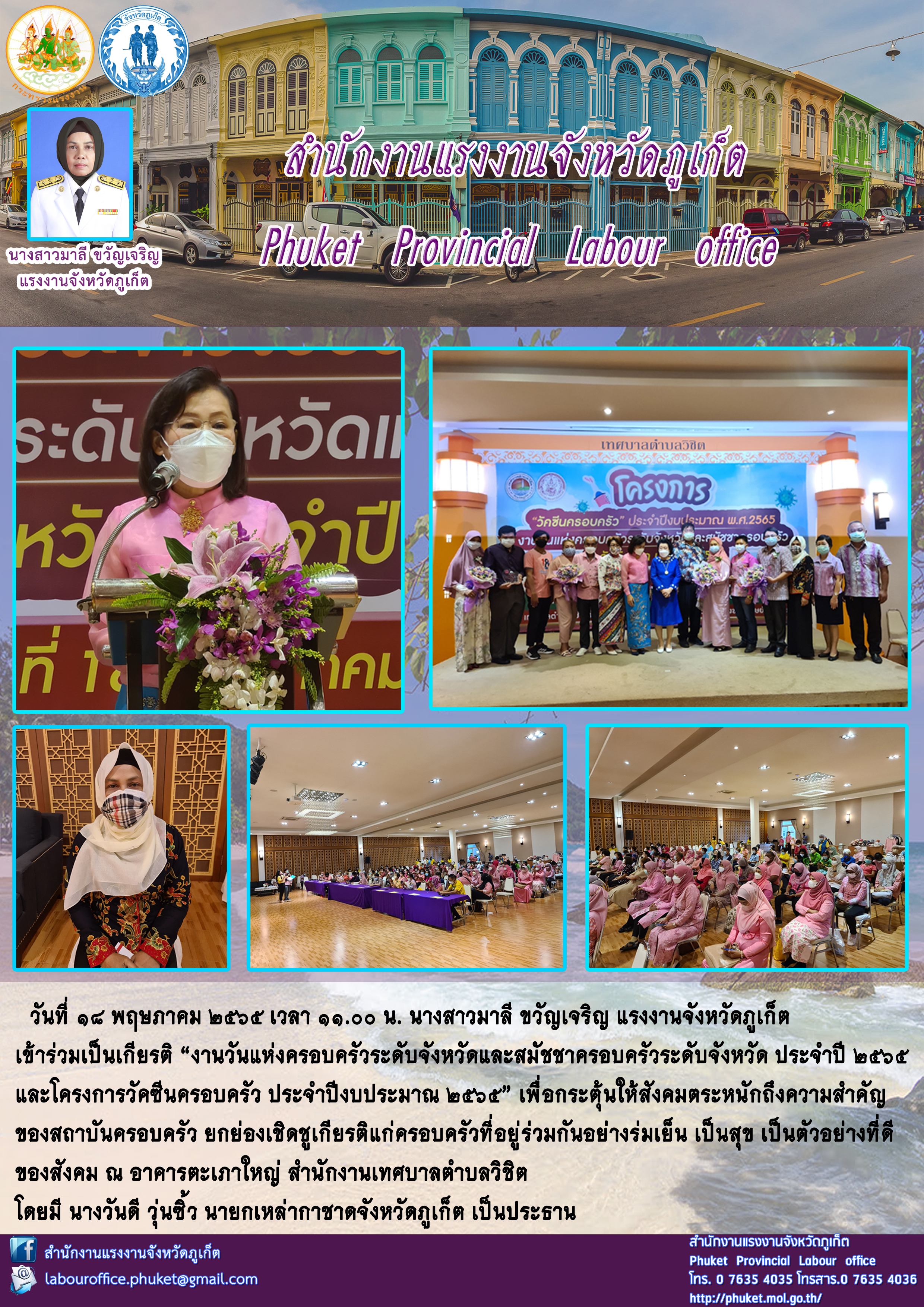 นางสาวมาลี ขวัญเจริญ แรงงานจังหวัดภูเก็ต เข้าร่วมเป็นเกียรติ “งานวันแห่งครอบครัวระดับจังหวัดและสมัชชาครอบครัวระดับจังหวัด ประจำปี 2565และโครงการวัคซีนครอบครัว ประจำปีงบประมาณ 2565”