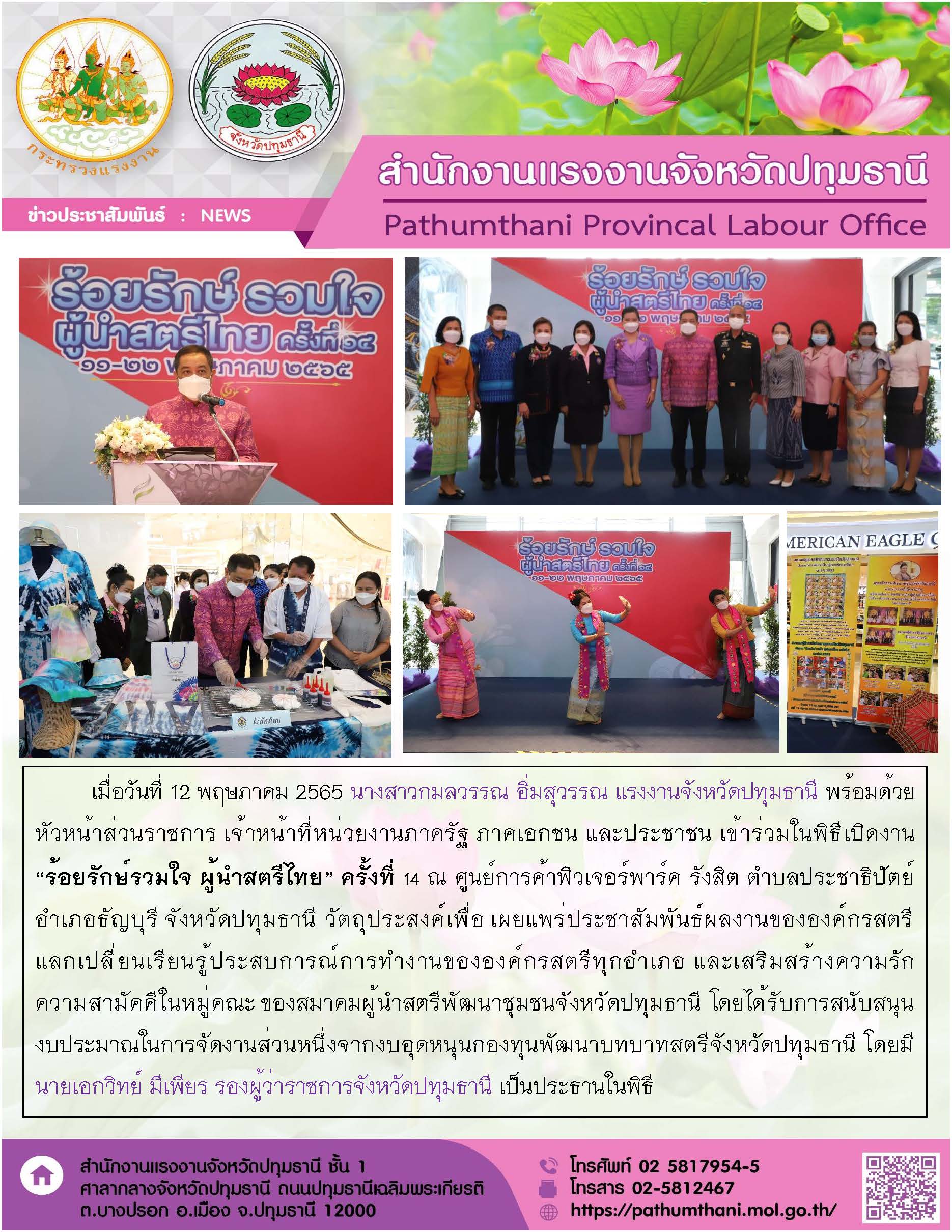 แรงงานจังหวัดปทุมธานี ร่วมพิธีเปิดงาน “ร้อยรักษ์รวมใจ วันสตรีไทย ครั้งที่ 14”