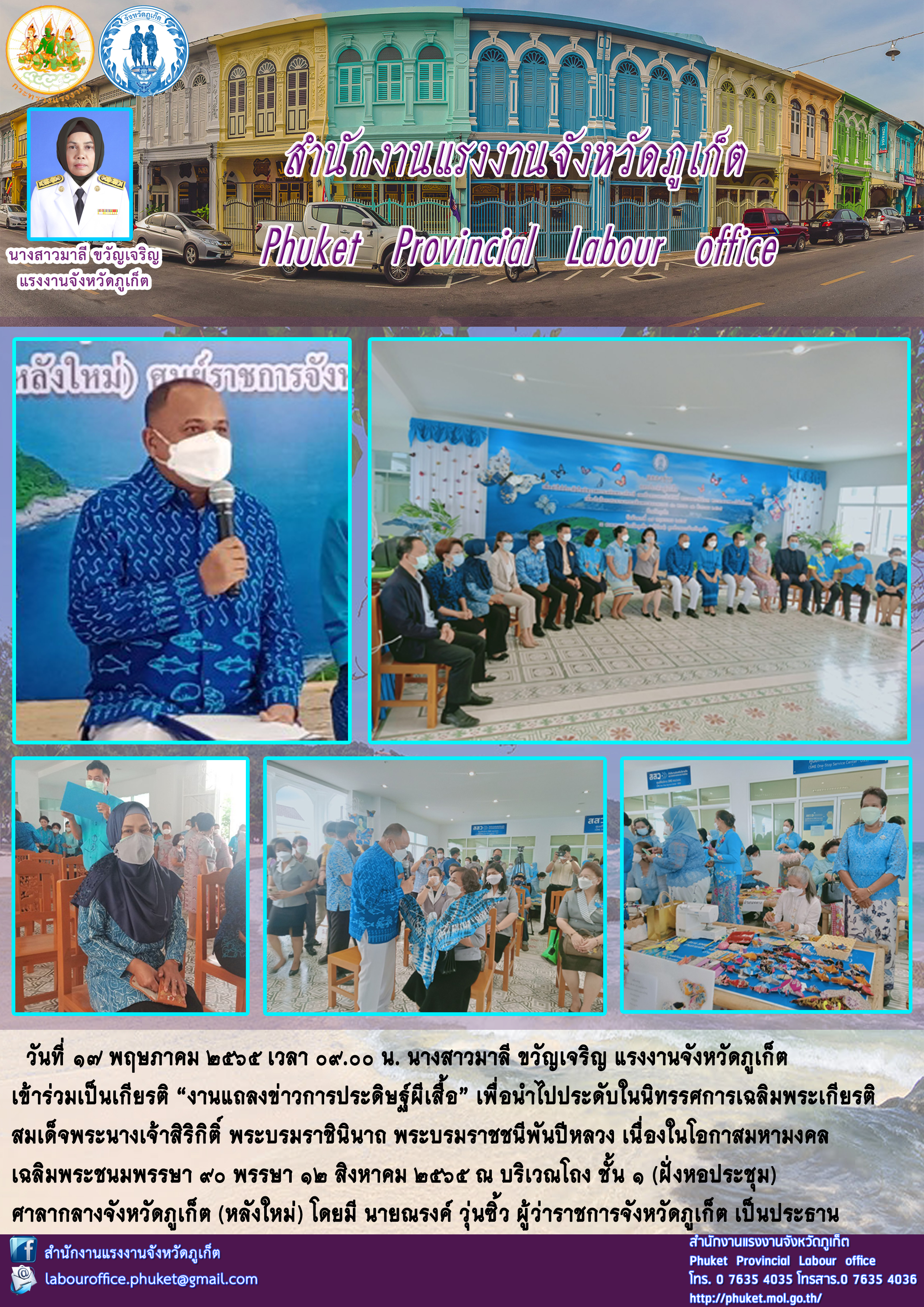 นางสาวมาลี ขวัญเจริญ แรงงานจังหวัดภูเก็ต เข้าร่วมบันทึกเทป “รายการพิเศษถวายพระพร สมเด็จพระนางเจ้าสุทิดา พัชรสุธาพิมลลักษณพระบรมราชินี ประจำปี 2565”