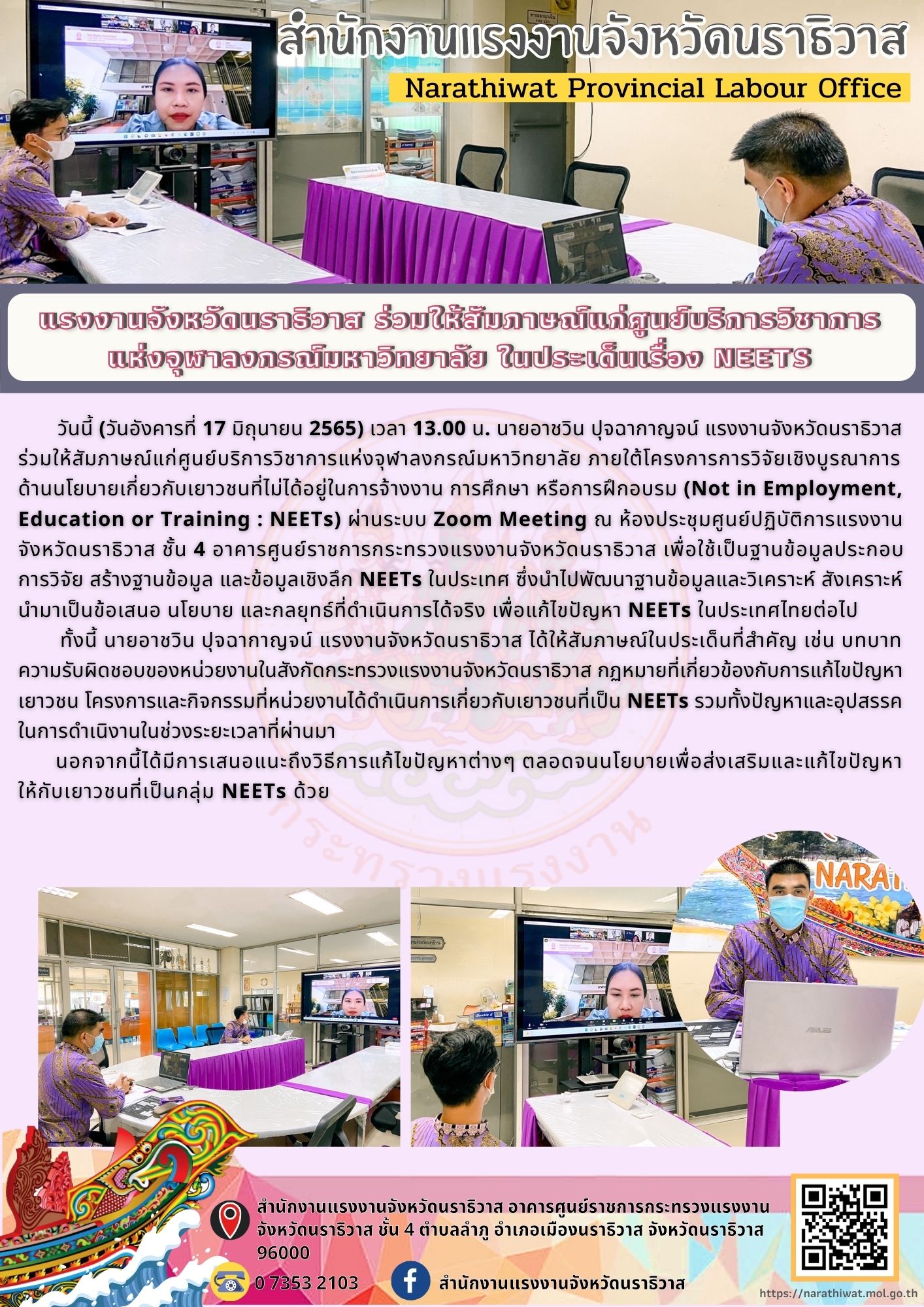 แรงงานจังหวัดนราธิวาส ร่วมให้สัมภาษณ์แก่ศูนย์บริการวิชาการแห่งจุฬาลงกรณ์มหาวิทยาลัย ในประเด็นเรื่อง NEETs