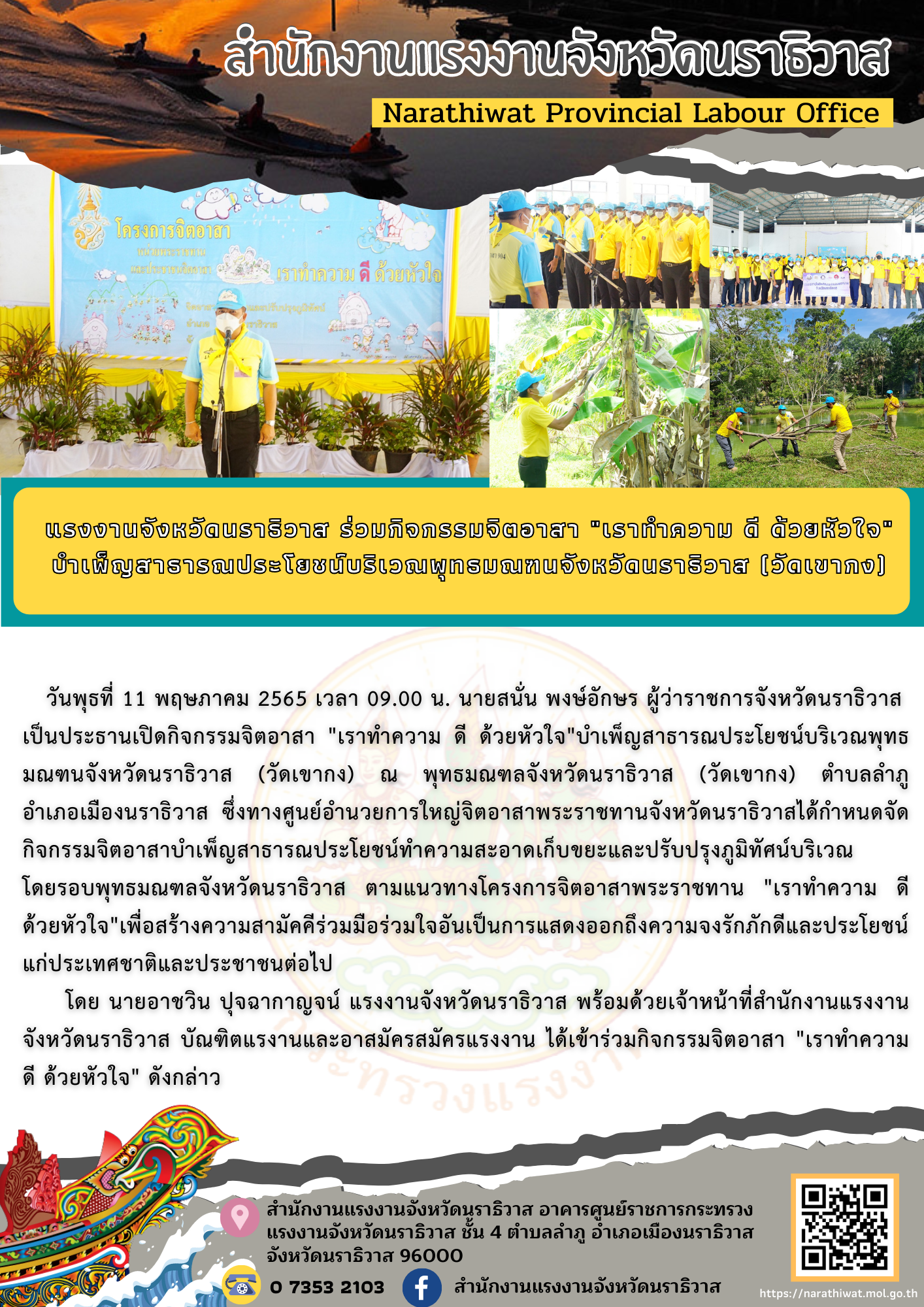 แรงงานจังหวัดนราธิวาส ร่วมกิจกรรมจิตอาสา “เราทำความ ดี ด้วยหัวใจ” บำเพ็ญสาธารณประโยชน์บริเวณพุทธมณฑนจังหวัดนราธิวาส (วัดเขากง)
