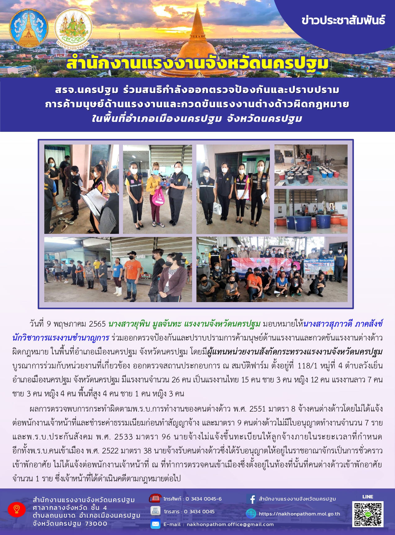 สรจ.นครปฐม ร่วมสนธิกำลังออกตรวจป้องกันและปราบปรามการค้ามนุษย์ด้านแรงงานและกวดขันแรงงานต่างด้าวผิดกฎหมาย ในพื้นที่อำเภอเมืองนครปฐม จังหวัดนครปฐม