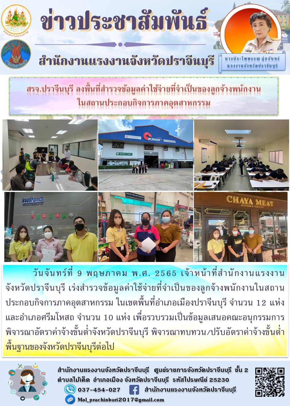 เจ้าหน้าที่สำนักงานแรงงาน จังหวัดปราจีนบุรี เร่งสำรวจข้อมูลค่าใช้จ่ายที่จำเป็นของลูกจ้างพนักงานในสถานประกอบกิจการภาคอุตสาหกรรม ในเขตพื้นที่อำเภอเมืองปราจีนบุรี จำนวน 12 แห่ง และอำเภอศรีมโหสถ จำนวน 10 แห่ง