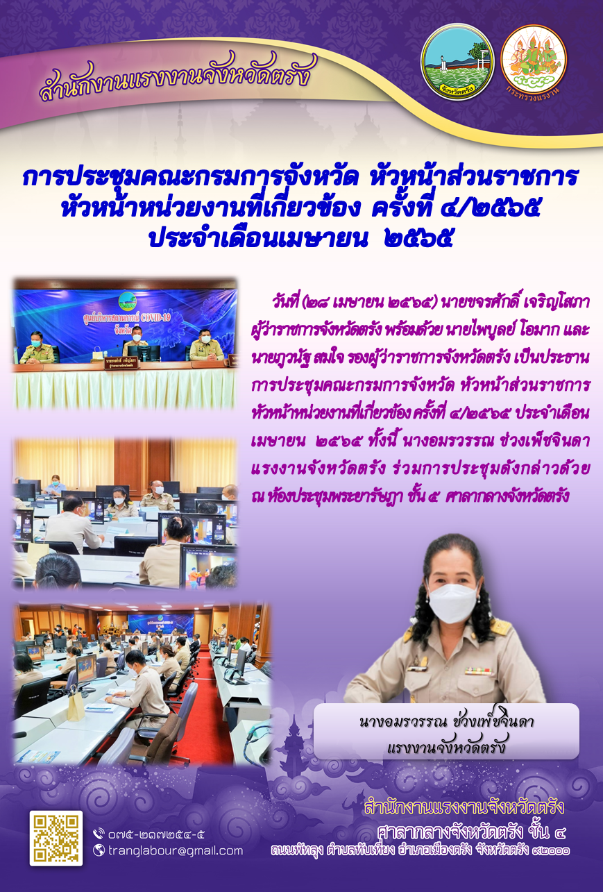 แรงงานจังหวัดตรัง ร่วมการประชุมคณะกรมการจังหวัด หัวหน้าส่วนราชการ หัวหน้าหน่วยงานที่เกี่ยวข้อง ครั้งที่ 4/2565 ประจำเดือนเมษายน 2565