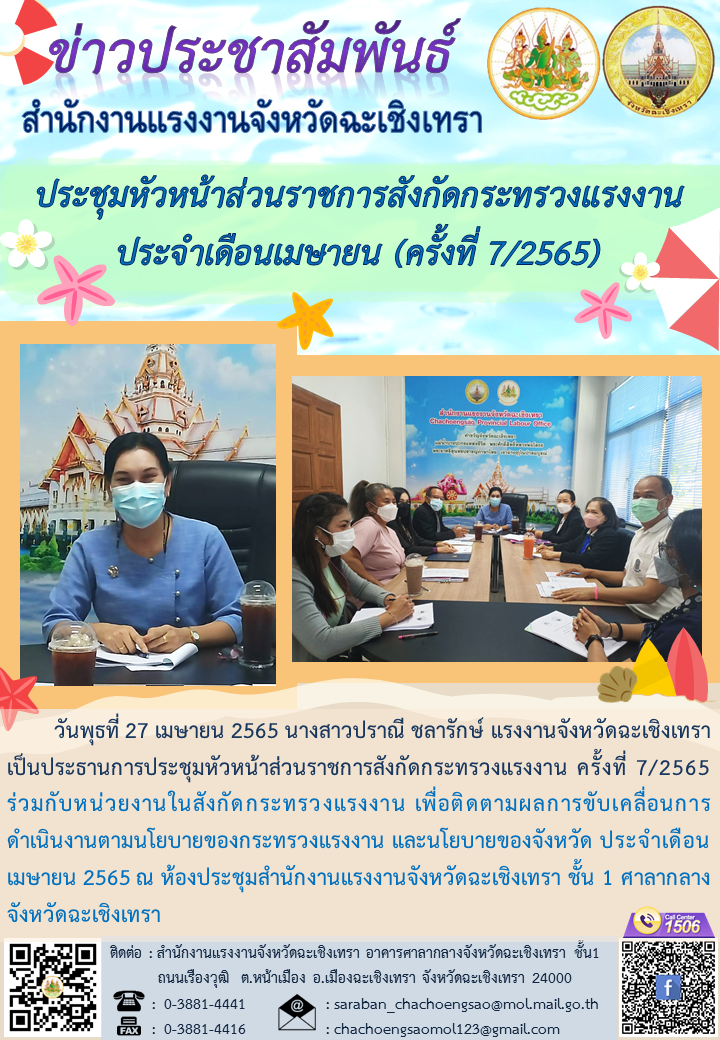 สรจ.ฉะเชิงเทรา ประชุมหัวหน้าส่วนราชการสังกัดกระทรวงแรงงาน ประจำเดือนมีนาคม ครั้งที่ 7/2565