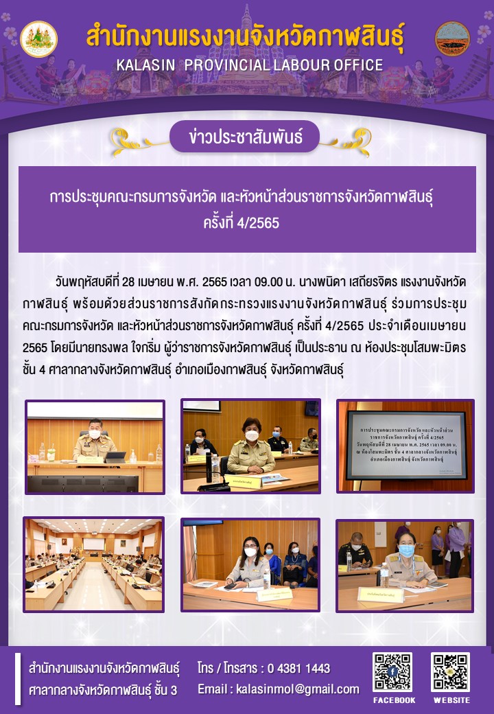 แรงงานจังหวัดกาฬสินธุ์ พร้อมด้วยส่วนราชการสังกัดกระทรวงแรงงานจังหวัดกาฬสินธุ์ ร่วมการประชุมคณะกรมการจังหวัด และหัวหน้าส่วนราชการจังหวัดกาฬสินธุ์ ครั้งที่ 4/2565