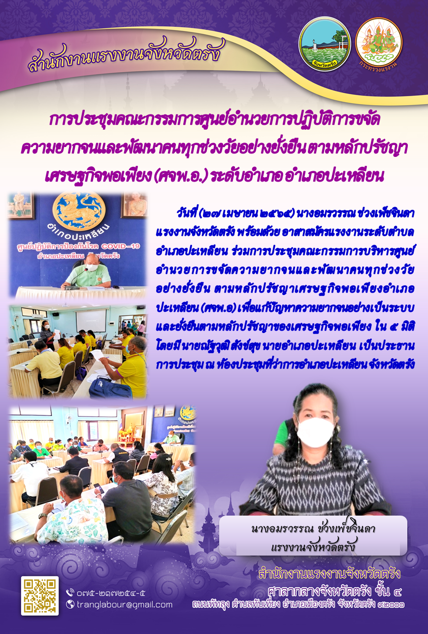 แรงงานจังหวัดตรัง พร้อมด้วย อาสาสมัครแรงงานระดับตำบลอำเภอปะเหลียน ร่วมการประชุมคณะกรรมการบริหารศูนย์อำนวยการขจัดความยากจนและพัฒนาคนทุกช่วงวัยอย่างยั่งยืน ตามหลักปรัชญาเศรษฐกิจพอเพียงอำเภอปะเหลียน (ศจพ.อ)