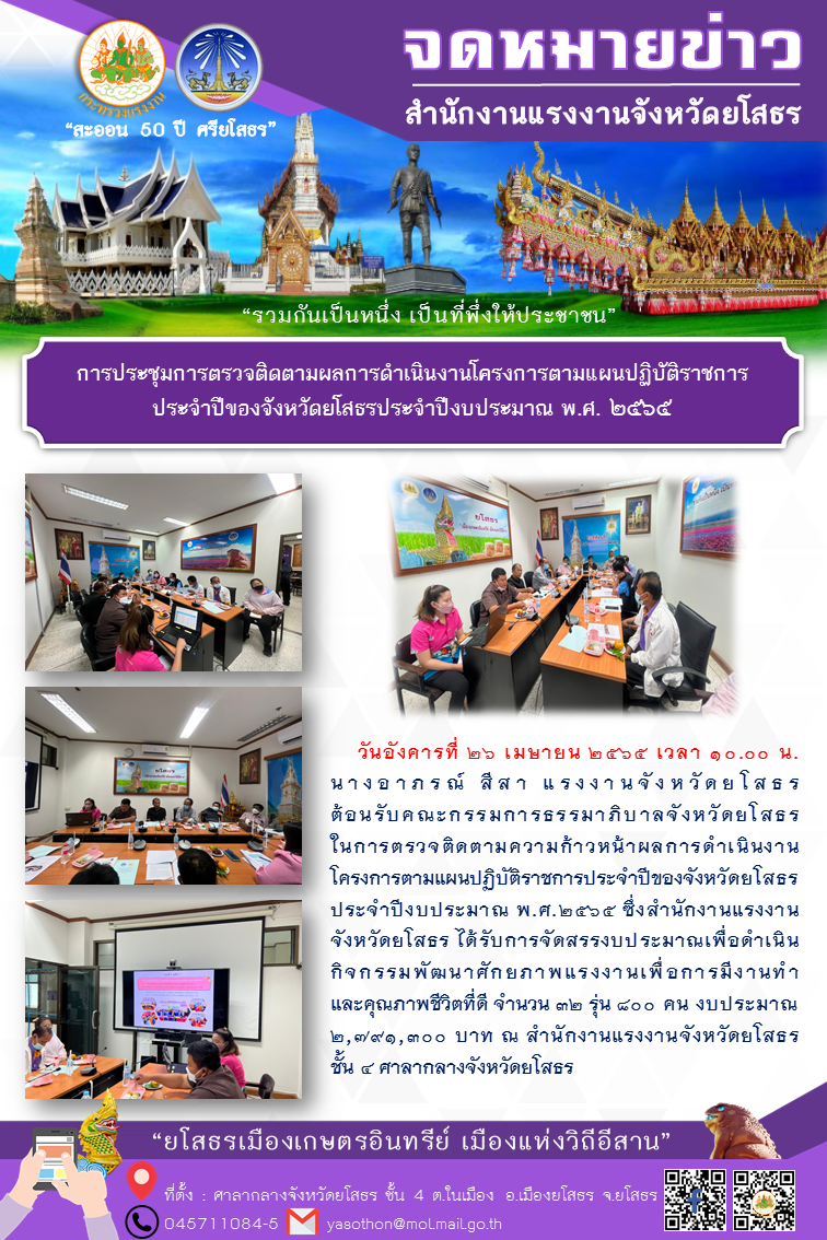 สรจ.ยโสธร ร่วมประชุมการตรวจติดตามผลการดำเนินงานโครงการตามแผนปฏิบัติราชการ ประจำปีของจังหวัดยโสธรประจำปีงบประมาณ พ.ศ. 2565