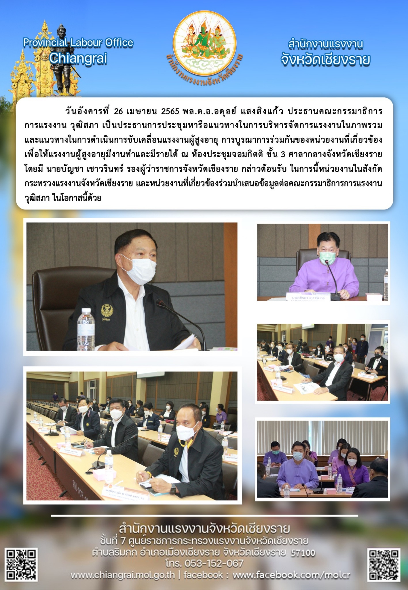 พลตำรวจโท ศานิตย์ มหถาวร ประธานคณะอนุกรรมาธิการด้านการจัดหางานและพัฒนาฝีมือแรงงานพร้อมคณะ เดินทางมาศึกษาดูงาน ณ ศูนย์บริการเบ็ดเสร็จด้านแรงงานฯ อำเภอแม่สาย จังหวัดเชียงราย นายขจร วงศ์สวย แรงงานจังหวัดเชียงรายและหัวหน้าส่วนในสังกัดกระทรวงแรงงานเข้าร่วมประชุม