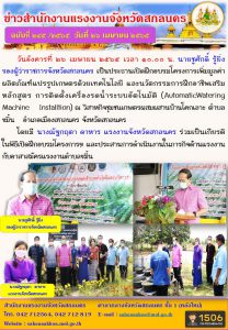 แรงงานจังหวัดสกลนคร ร่วมเป็นเกียรติพิธีเปิดอบรมโครงการเพิ่มมูลค่าผลิตภัณฑ์แปรรูปเกษตรด้วยด้วยเทคโนโลยี และนวัตกรรมการฝึกอาชีพเสริมหลักสูตร การติดตั้งเครื่องรดน้ำระบบอัตโนมัติ