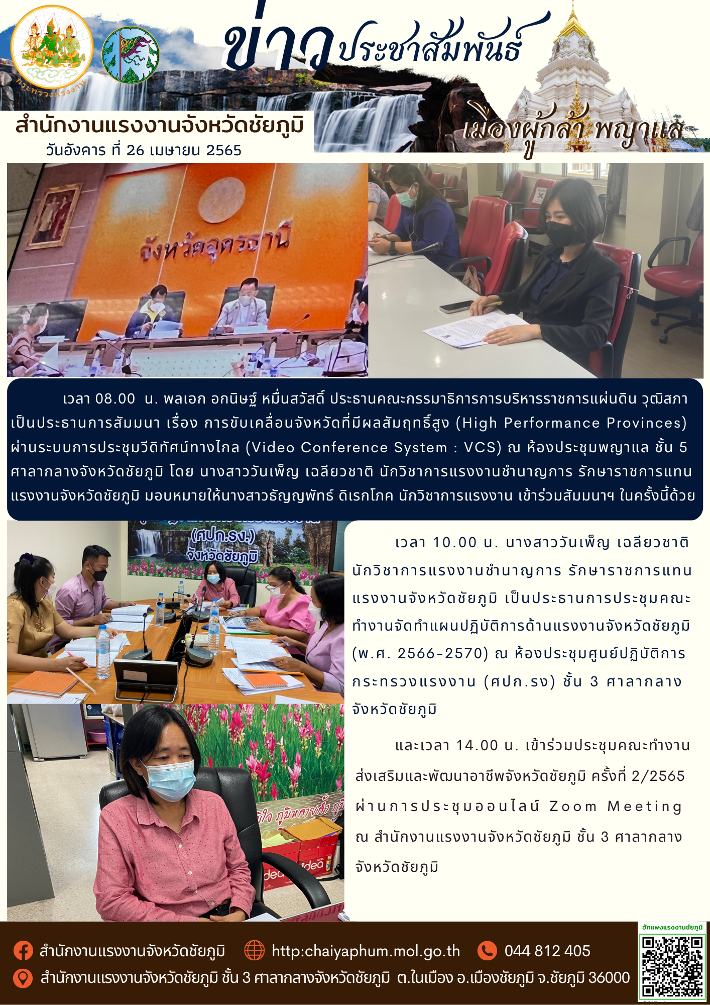 พลเอก อกนิษฐ์ หมื่นสวัสดิ์ ประธานคณะกรรมาธิการการบริหารราชการแผ่นดิน วุฒิสภา เป็นประธานการสัมมนา เรื่อง การขับเคลื่อนจังหวัดที่มีผลสัมฤทธิ์สูง (High Performance Provinces) ผ่านระบบการประชุมวีดิทัศน์ทางไกล (Video Conference System : VCS) ณ ห้องประชุมพญาแล ชั้น 5 ศาลากลางจังหวัดชัยภูมิ /และการประชุมคณะ ทำงานจัดทำแผนปฏิบัติการด้านแรงงานจังหวัดชัยภูมิ (พ.ศ. 2566-2570) ณ ห้องประชุมศูนย์ปฏิบัติการกระทรวงแรงงาน (ศปก.รง) ชั้น 3 ศาลากลาง จังหวัดชัยภูมิ