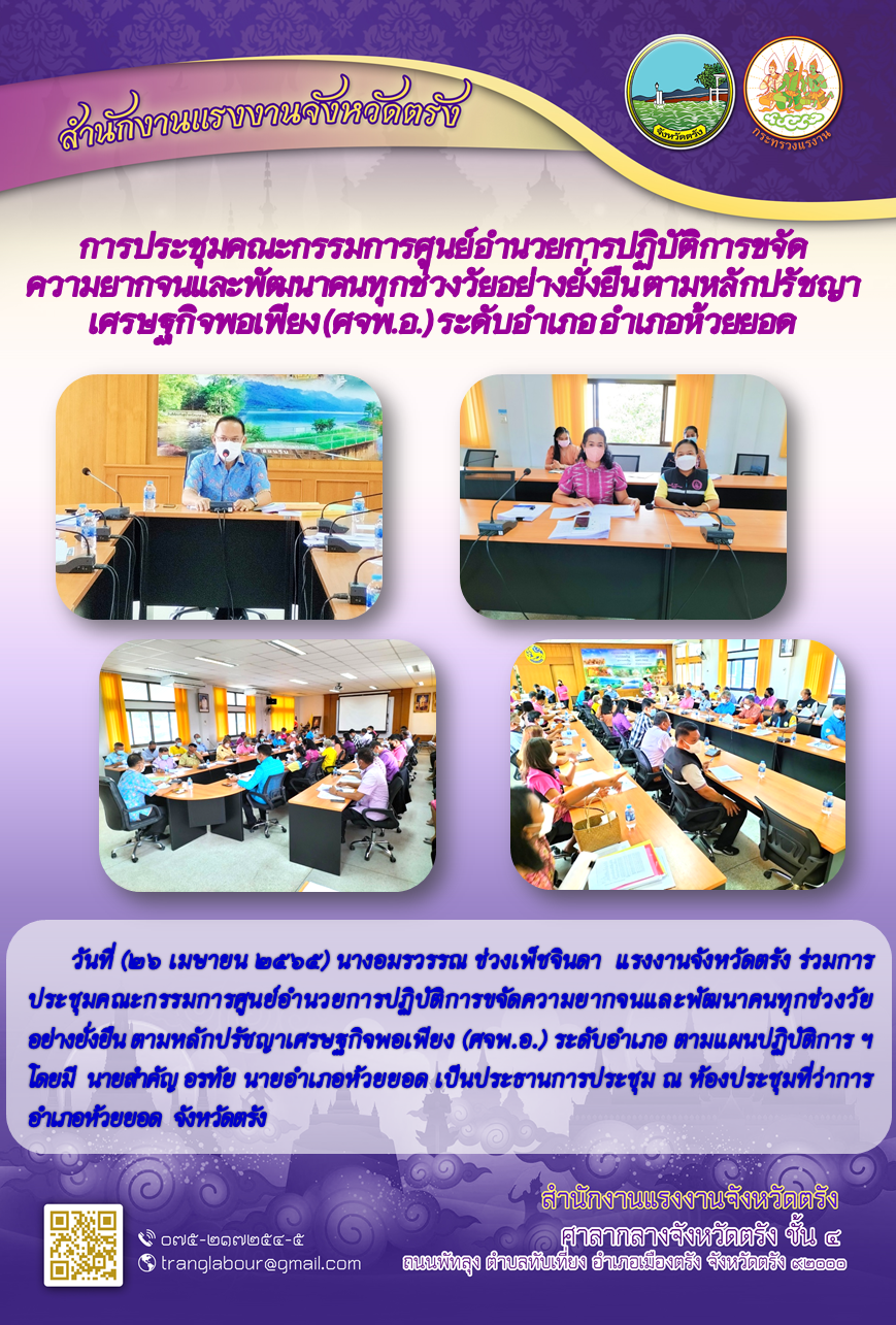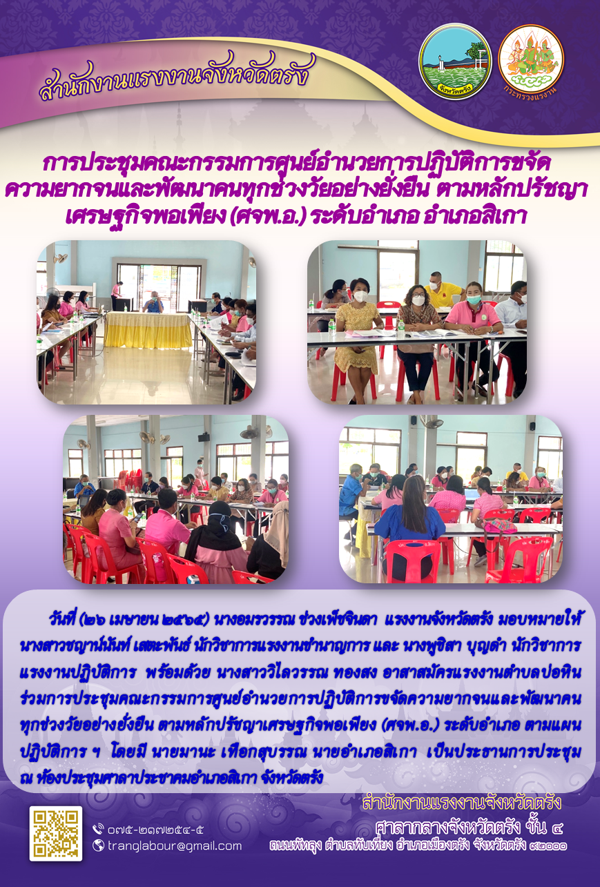 แรงงานจังหวัดตรัง ร่วมการประชุมคณะกรรมการศูนย์อำนวยการปฏิบัติการขจัด ความยากจนและพัฒนาคนทุกช่วงวัยอย่างยั่งยืน ตามหลักปรัชญาเศรษฐกิจพอเพียง (ศจพ.อ.) จังหวัดตรัง