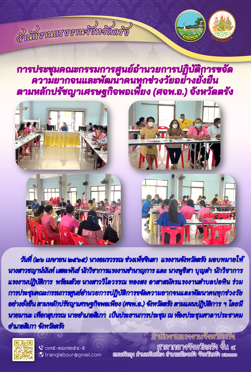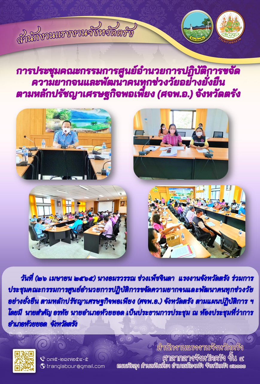 แรงงานจังหวัดตรัง ร่วมการประชุมคณะกรรมการศูนย์อำนวยการปฏิบัติการขจัดความยากจนและพัฒนาคนทุกช่วงวัยอย่างยั่งยืน ตามหลักปรัชญาเศรษฐกิจพอเพียง (ศจพ.อ.) จังหวัดตรัง