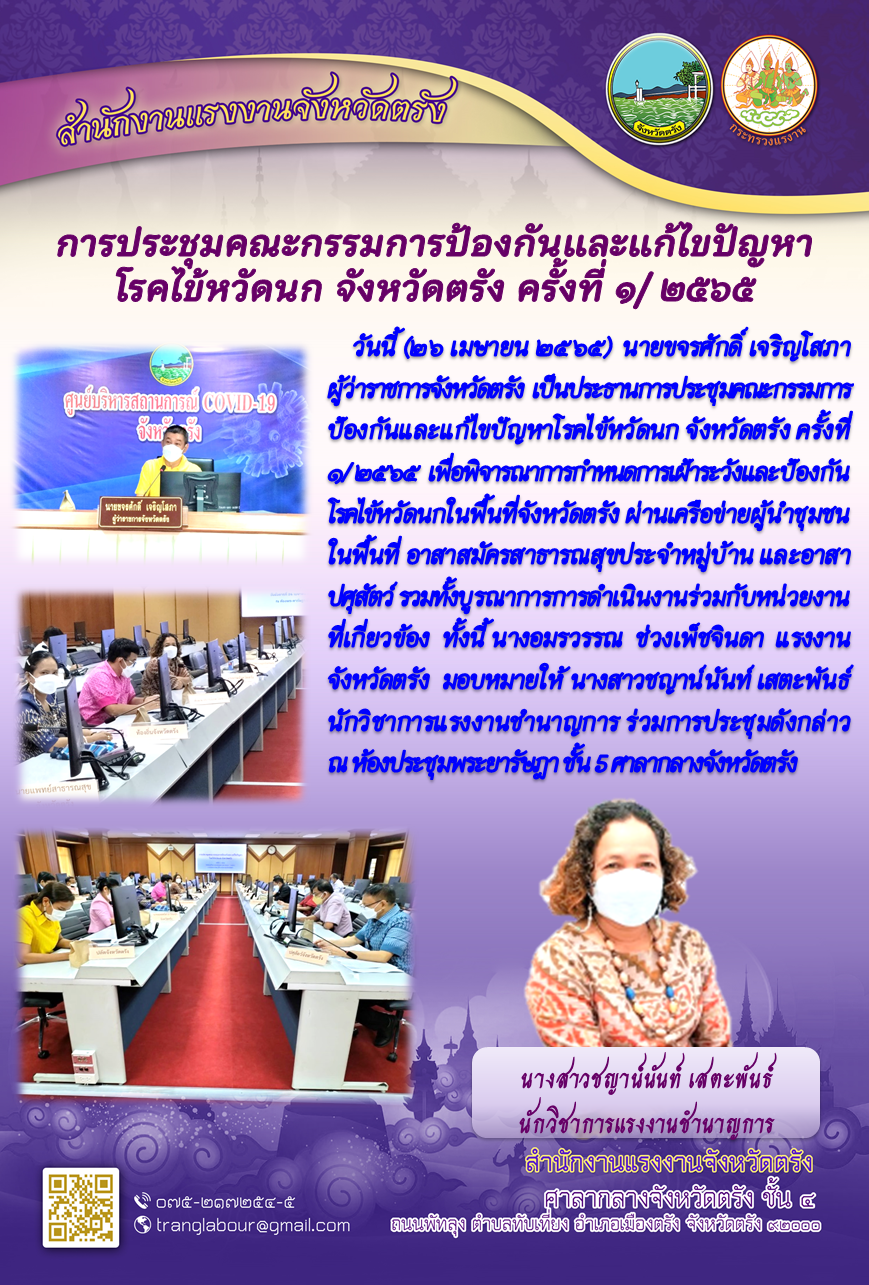 แรงงานจังหวัดตรัง มอบหมายให้ นางสาวชญาน์นันท์ เสตะพันธ์ นักวิชาการแรงงานชำนาญการ ร่วมการประชุมคณะกรรมการป้องกันและแก้ไขปัญหาโรคไข้หวัดนก จังหวัดตรัง ครั้งที่ ๑/ ๒๕๖๕