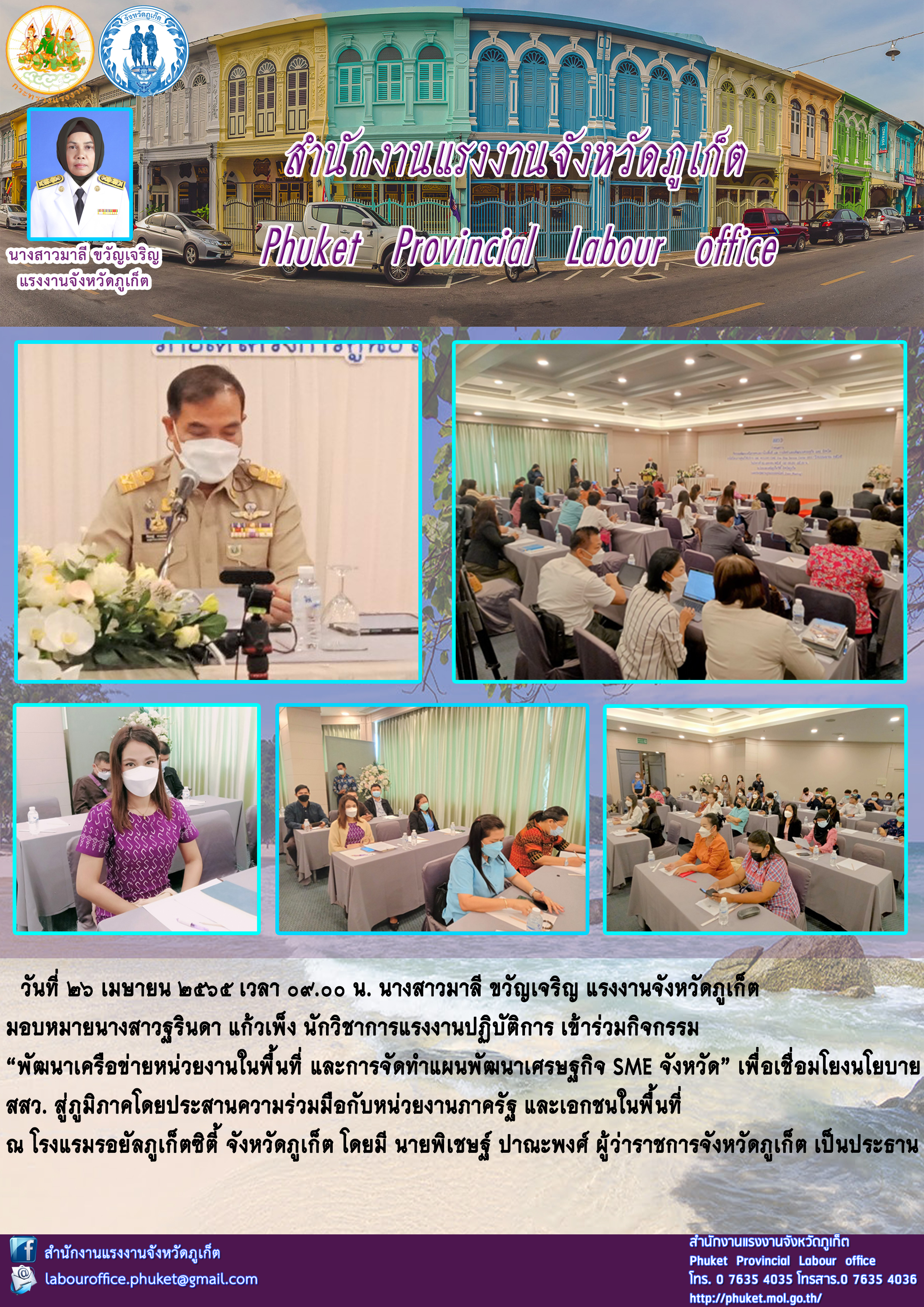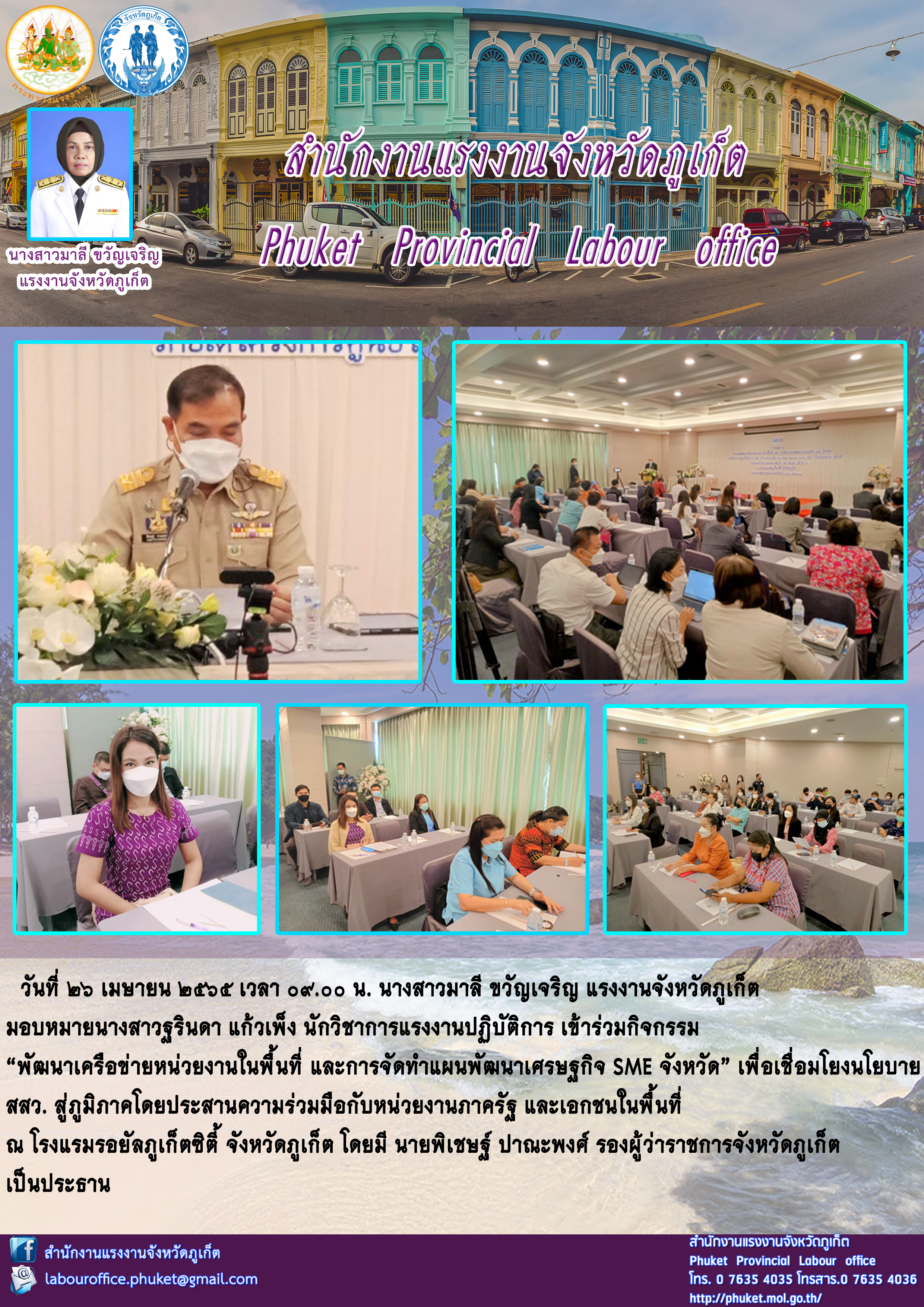 นางสาวมาลี ขวัญเจริญ แรงงานจังหวัดภูเก็ต มอบหมายนางสาวฐรินดา แก้วเพ็ง นักวิชาการแรงงานปฏิบัติการ เข้าร่วมกิจกรรม “พัฒนาเครือข่ายหน่วยงานในพื้นที่ และการจัดทำแผนพัฒนาเศรษฐกิจ SME จังหวัด”