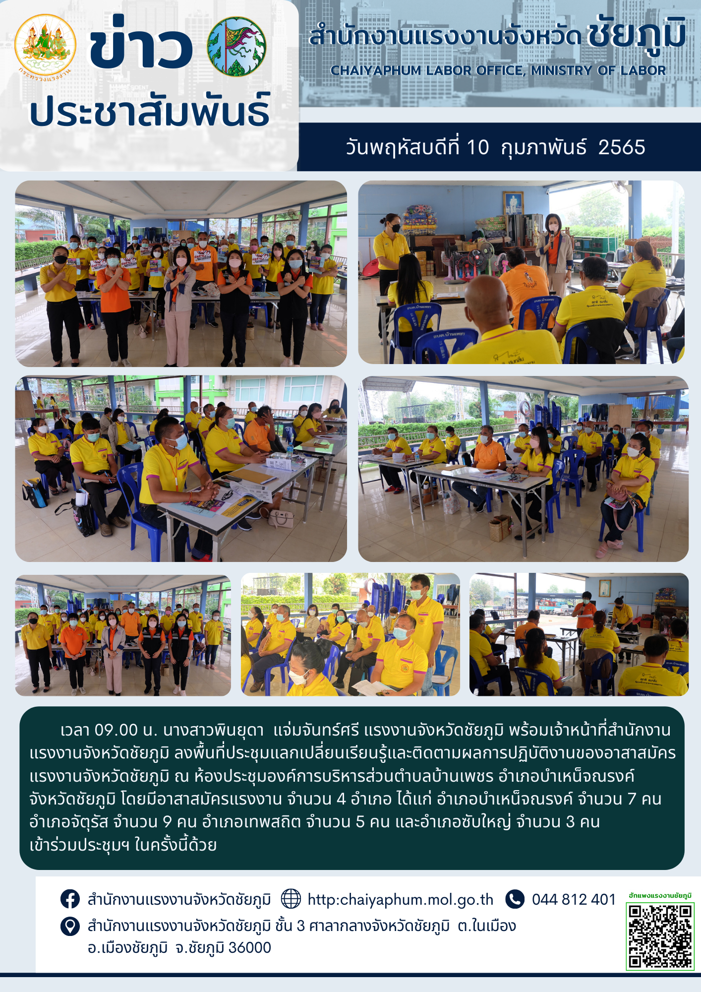 แรงงานจังหวัดชัยภูมิ ลงพื้นที่ประชุมแลกเปลี่ยนเรียนรู้และติดตามผลการปฏิบัติงานของอาสาสมัครแรงงานจังหวัดชัยภูมิ