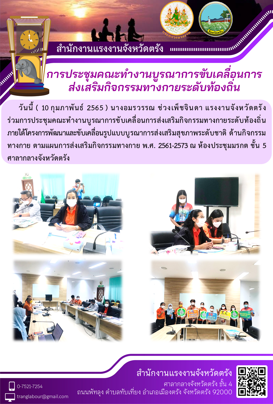 แรงงานจังหวัดตรัง ร่วมการประชุมคณะทำงานบูรณาการขับเคลื่อนการส่งเสริมกิจกรรมทางกายระดับท้องถิ่น