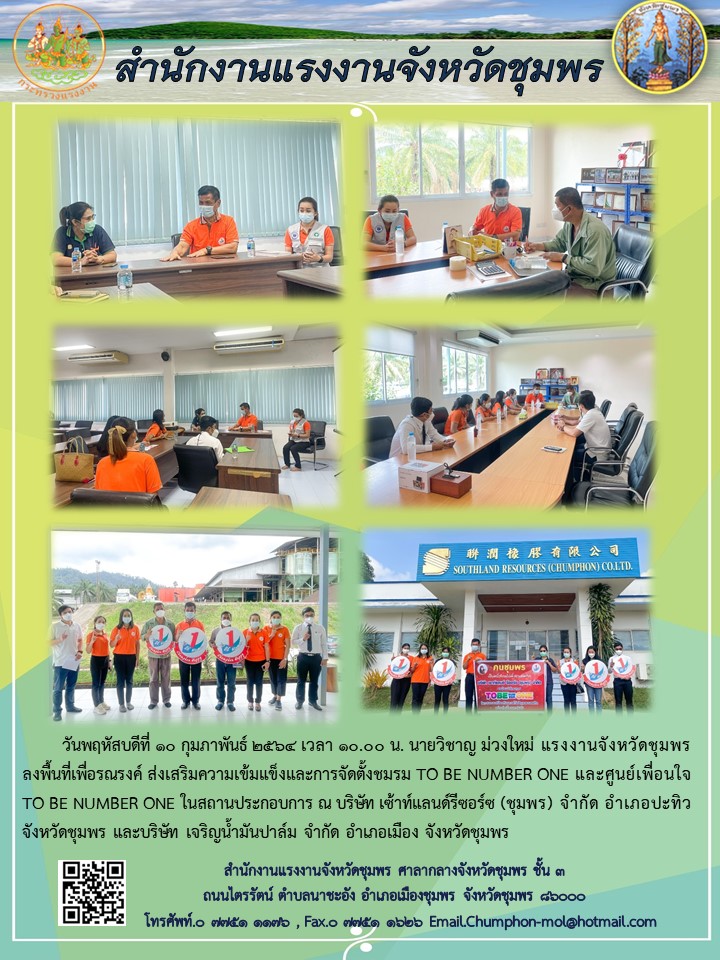แรงงานจังหวัดชุมพรลงพื้นที่รณรงค์ ส่งเสริมชมรม/ศูนย์เพื่อนใจ TO BE NUMBER ONE ในสถานประกอบการ