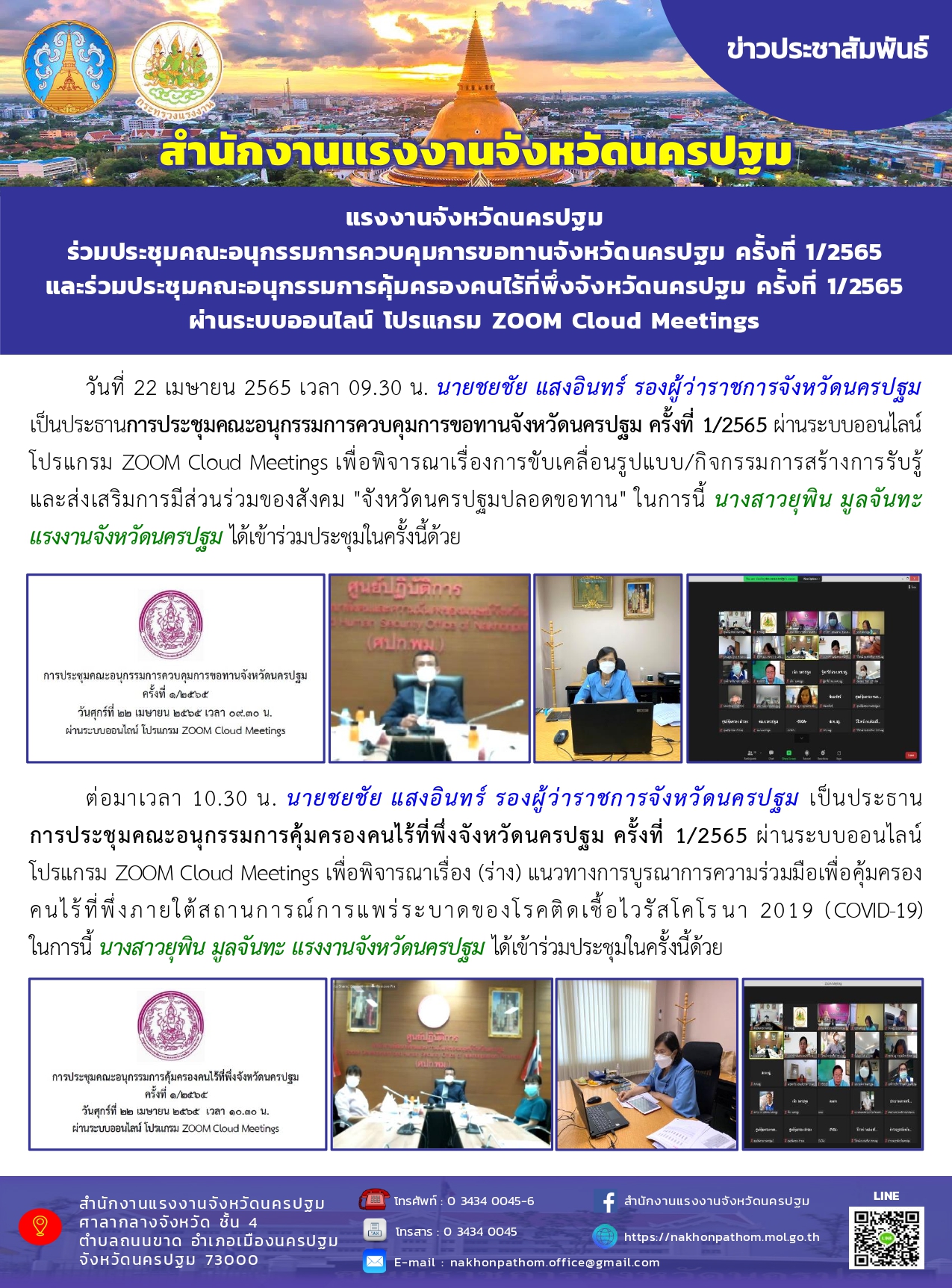 แรงงานจังหวัดนครปฐม ร่วมประชุมคณะอนุกรรมการควบคุมการขอทานจังหวัดนครปฐม ครั้งที่ 1/2565 และร่วมประชุมคณะอนุกรรมการคุ้มครองคนไร้ที่พึ่งจังหวัดนครปฐม ครั้งที่ 1/2565 ผ่านระบบออนไลน์ โปรแกรม ZOOM Cloud Meetings